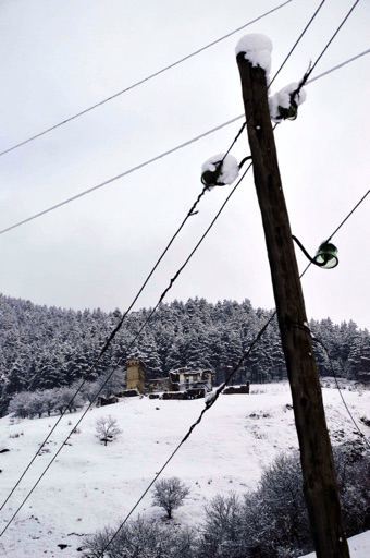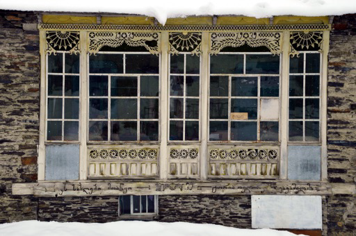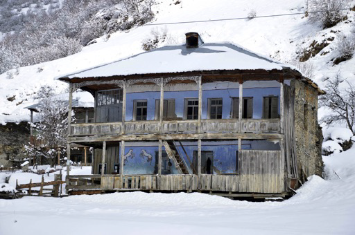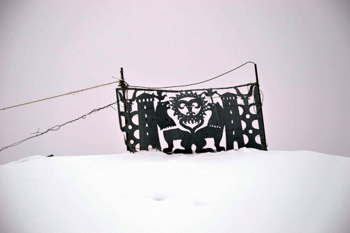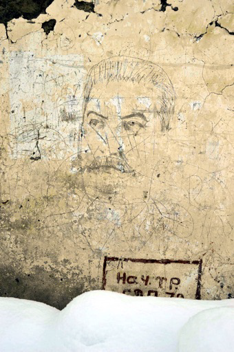 Caminamos delante de los bueyes. Pasamos ante unas casas abandonadas cuyas ventanas con persianas torcidas boquean mudas en un desmoronamiento de yeso. Suponemos que a medida que la atracción por el estilo de vida moderno se hace más realizable la gente simplemente descarta este tipo de construcciones por otras mejores y en mejores lugares. Ahora no nos resulta difícil percibir el aislamiento de pleno invierno en este lugar inaccesible. Una interpretación notablemente fina de la cara de Stalin decora el yeso de uno de los muros.