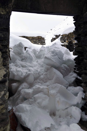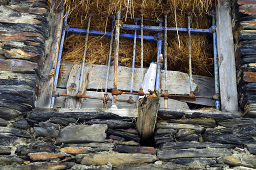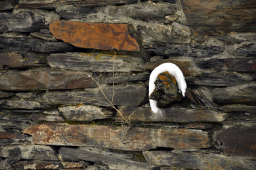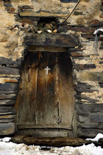 Paseamos entre las milenarias edificaciones de la aldea inferior, algunas datan del siglo VIII. De vez en cuando se ve una vaca o algún caballo de osamenta triste, pero no hay personas. Nos envuelven las paredes de lascas grises, irregulares, que dan vida a líquenes de color naranja oxidado y esconden finas briznas de hierba, ahora seca. Rompe el silencio de tanto en tanto un gallo, el ladrido de un perro o el mugido de una vaca descontenta. Una pequeña jauría de perros semisalvajes con pinta de tener hambre ha advertido nuestra presencia e intentamos seguir tomando fotos en la poca luz que queda sin perderlos de vista.