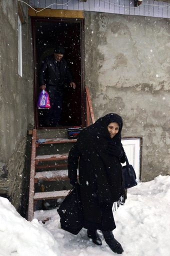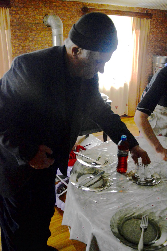 Su suegro, de unos setenta años, entra en la cocina atraído por el ruido de los huéspedes («Un huésped es un regalo de Dios», dice un viejo refrán georgiano). Trae consigo una botella de aguardiente casero. Nos cuenta que durante la época soviética fue piloto de aviación con base en Kiev, y ahora enseña ruso a los niños de la escuela. Cuando comemos brinda con nosotros tres veces (tres veces es la costumbre, nos dice), por la familia, por la amistad, y para que no haya guerra en Donetsk, ni en Abjasia, ni Osetia del Sur.