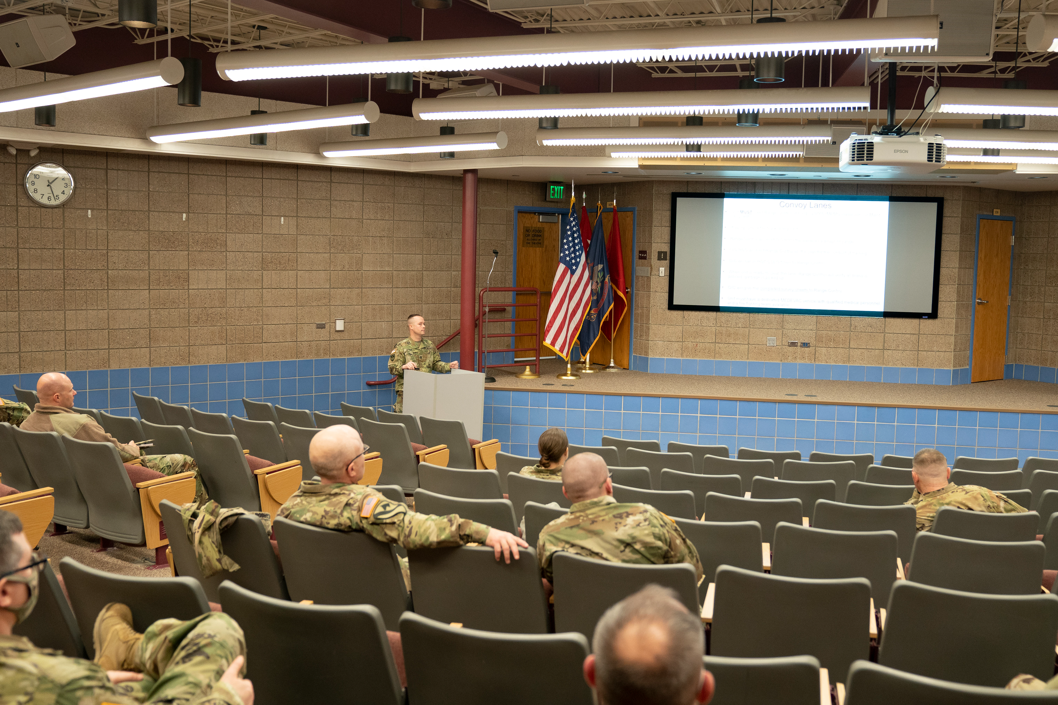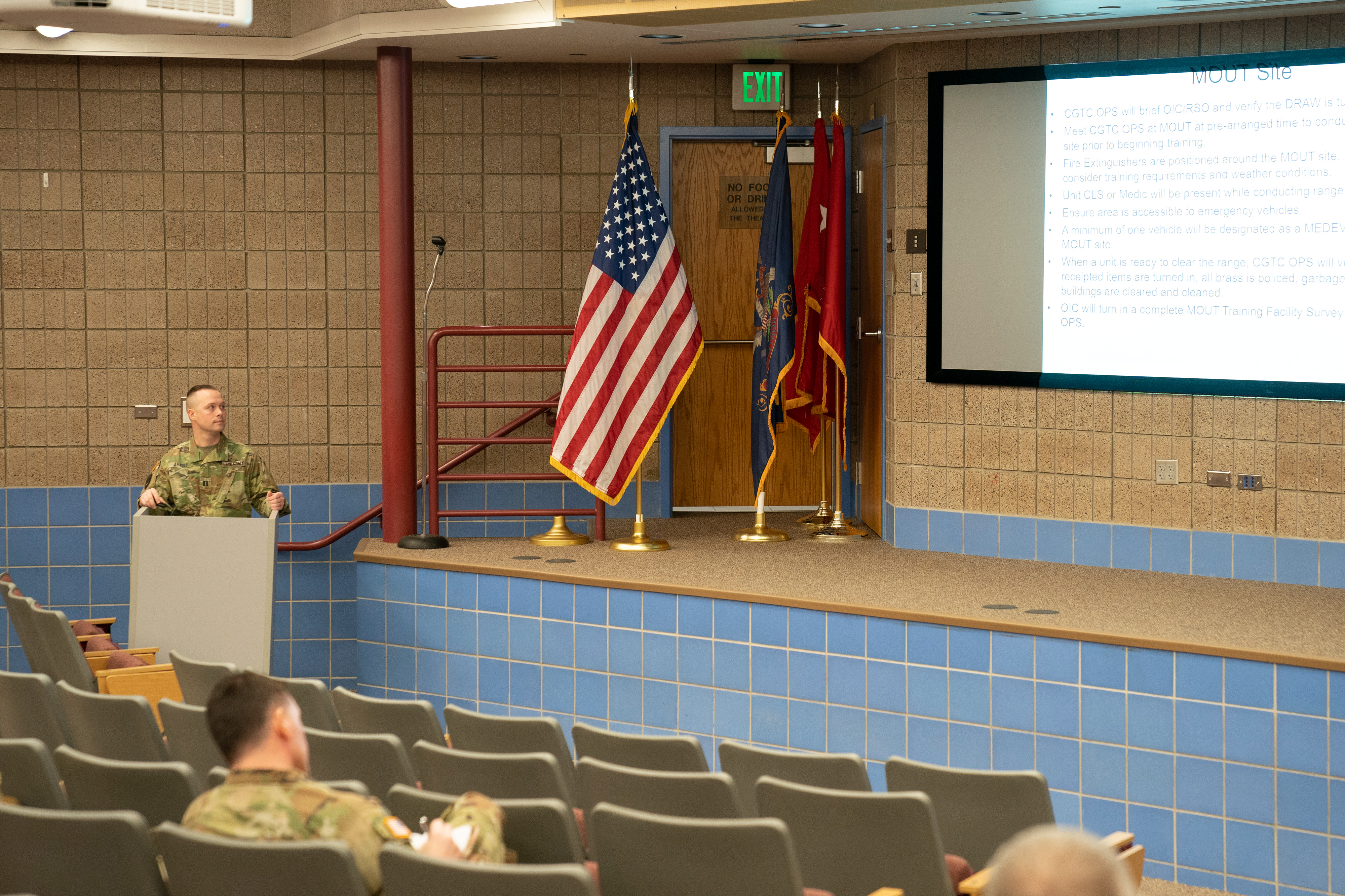 Captain Corey Arnold, Camp Grafton Training Center (CGTC) Range Officer, led the Camp Grafton Training Center's range officer-in-charge/range safety officer (OIC / RSO) certification course at the Raymond J. Bohn armory, Feb. 15, 2022. (National Guard story and photos by Capt. Vanessa Lennick, N.D. National Guard Visual Information)