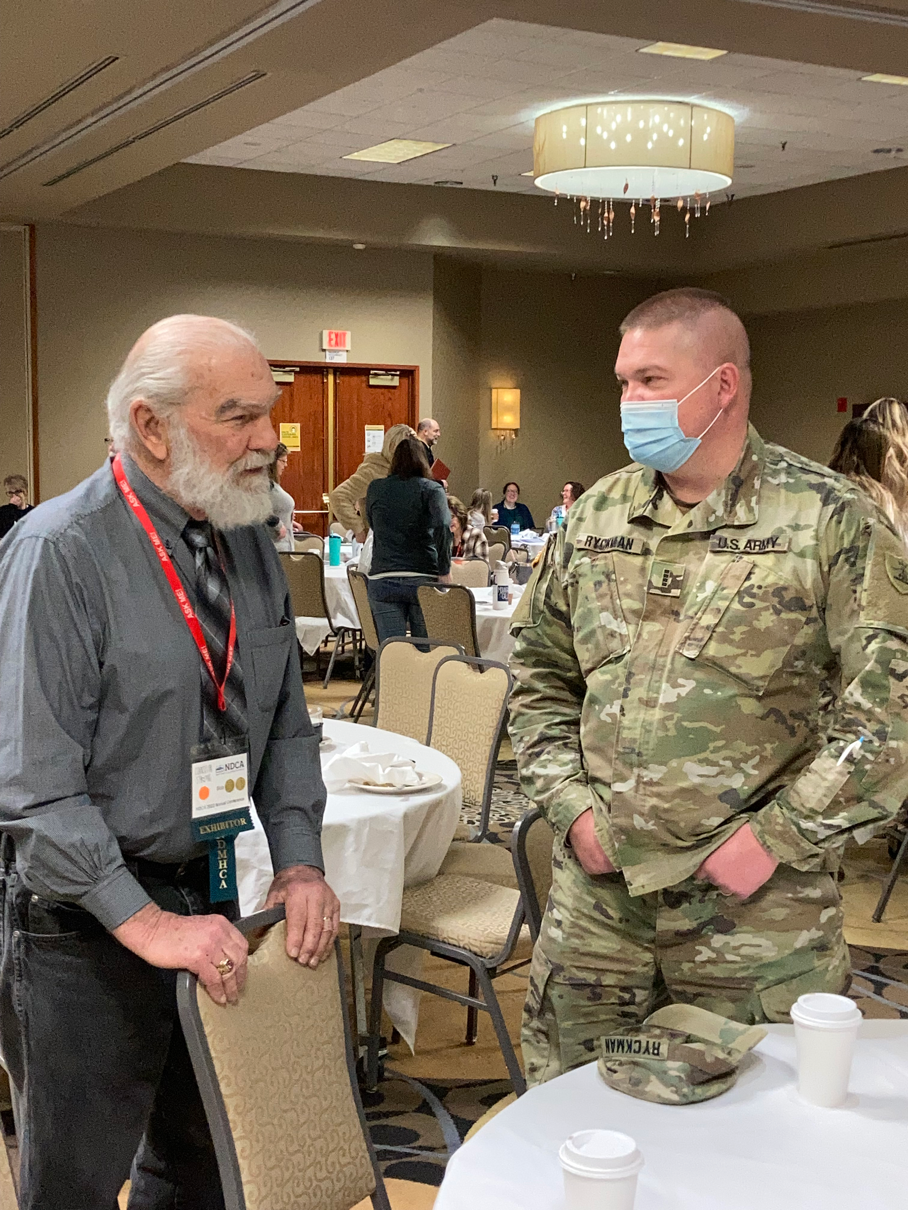 Chief Warrant Officer 4 Jammy Ryckman, production officer-in-charge, N.D. Army National Guard Recruiting and Retention Battalion, speaks with a counselor at the N.D. Counselor Association annual event, Bismarck, Feb. 14. 2022.