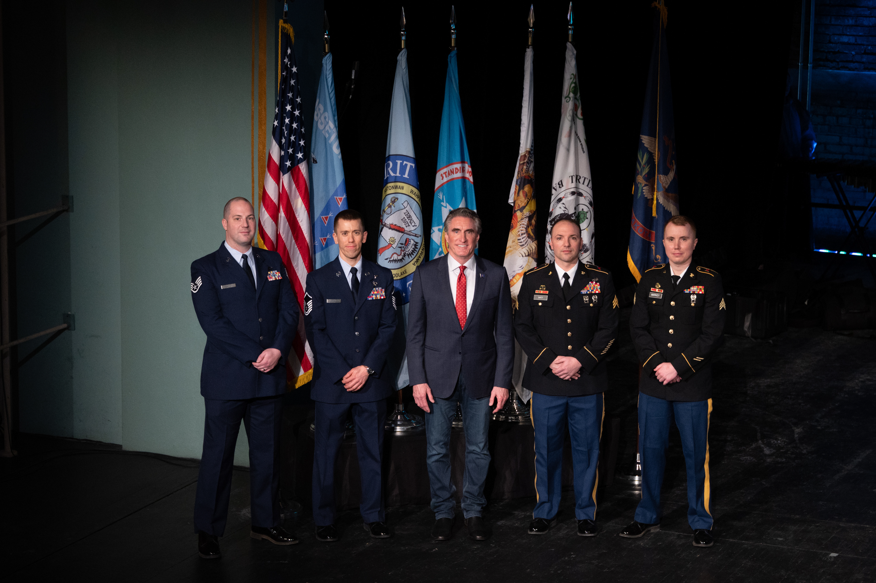 From left to right, 119th Wing Airmen Staff Sgt. Tyrell Martin and Master Sgt. Aaron Fagerwick; Gov. Doug Burgum; Sgt. Curtis Savey and Sgt. Jacob Markey, 141st Maneuver Enhancement Brigade, at the Governor's annual State of the State address, Fargo, Feb. 16, 2022.
