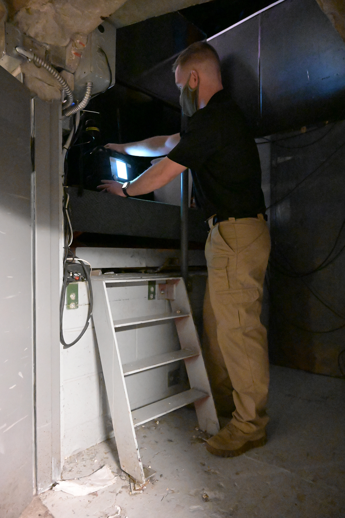 Sergeant Domonic Delaney, 81st Civil Support Team, sets up and tests electronic hazardous material detection equipment in the balcony observation area at Gov. Doug Burgum’s State of the State address, Fargo, N.D., Feb. 16, 2022.