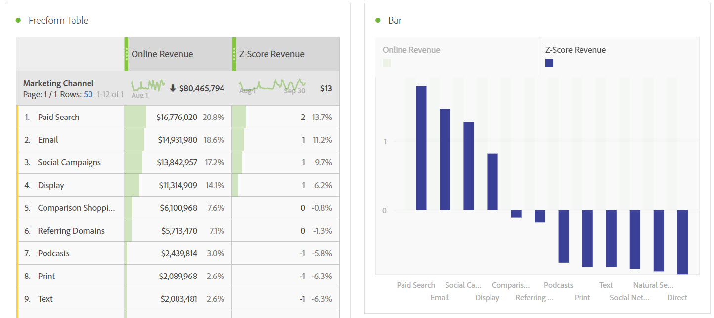 Calculating standard deviation using Z-Score - Z-score is the number of standard deviations an observation is from the mean and can be + or -, indicating whether it is above or below the mean and by how many standard deviations. This can be helpful for highlighting dimension items that are above the mean, such as marketing channels that drive above average revenue.