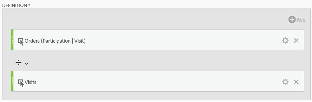 Metrics within metrics - You can use calculated metrics to create new metrics. For example, the denominator below is a calculated metric itself.