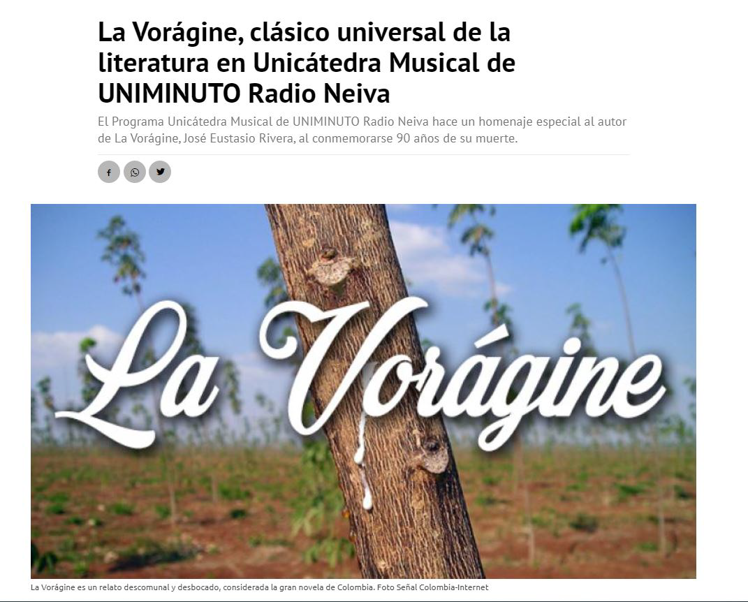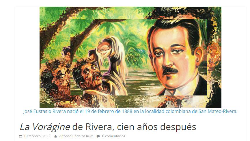 En el año 2024 se cumplirán los primeros 100 años de la publicación de la Vorágine del escritor huilense José Eustasio Rivera, y por ello el Club y Laboratorio de Inteligencia Humana, CLIH, la Empresa Zago Asesorías Neiva y el portal Informativo NoticiasAlSur, http://noticiasalsur.co/ presentan esta página para compartir Historias, Análisis, Testimonios y Relatos, sobre esta importante obra literaria y su autor.