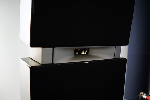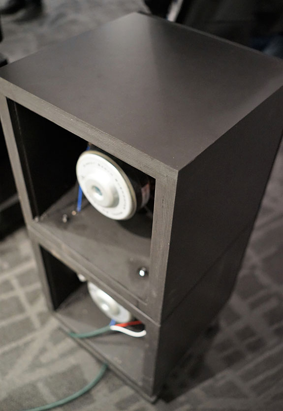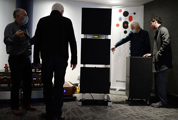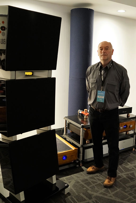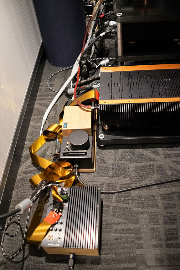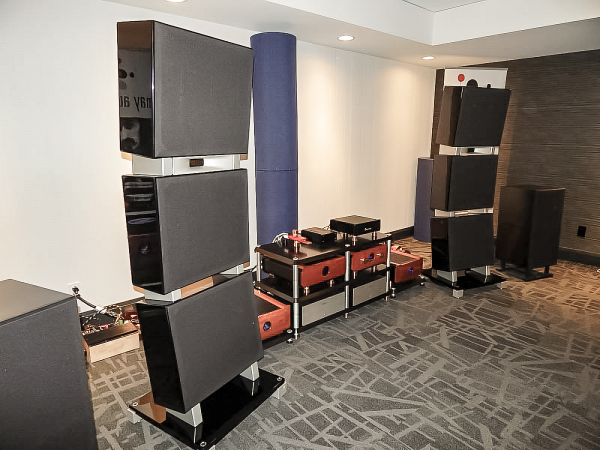 While others examined the system Francois invited me to the hallway where he explained the three rectangular modules of these Hommage Dayton Wright speakers each contained three NOS electrostatic panels from vintage Dayton Wright speakers. Only the center channel of the center speaker is run full-range, while the others are confined closer to 3kHz midrange at the upper limit for tonality. A pair of open-back subwoofers from GR Research supplement the bass and a Mundorf ribbon tweeter augments the highest frequencies. The speakers sat on custom-designed stands from Modumlum, as did the components in the rig. I met Jean-Francois Michaud of Modulum who did the design work to minimize the vibrations of this tall design.
