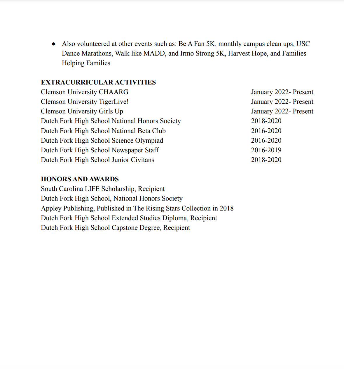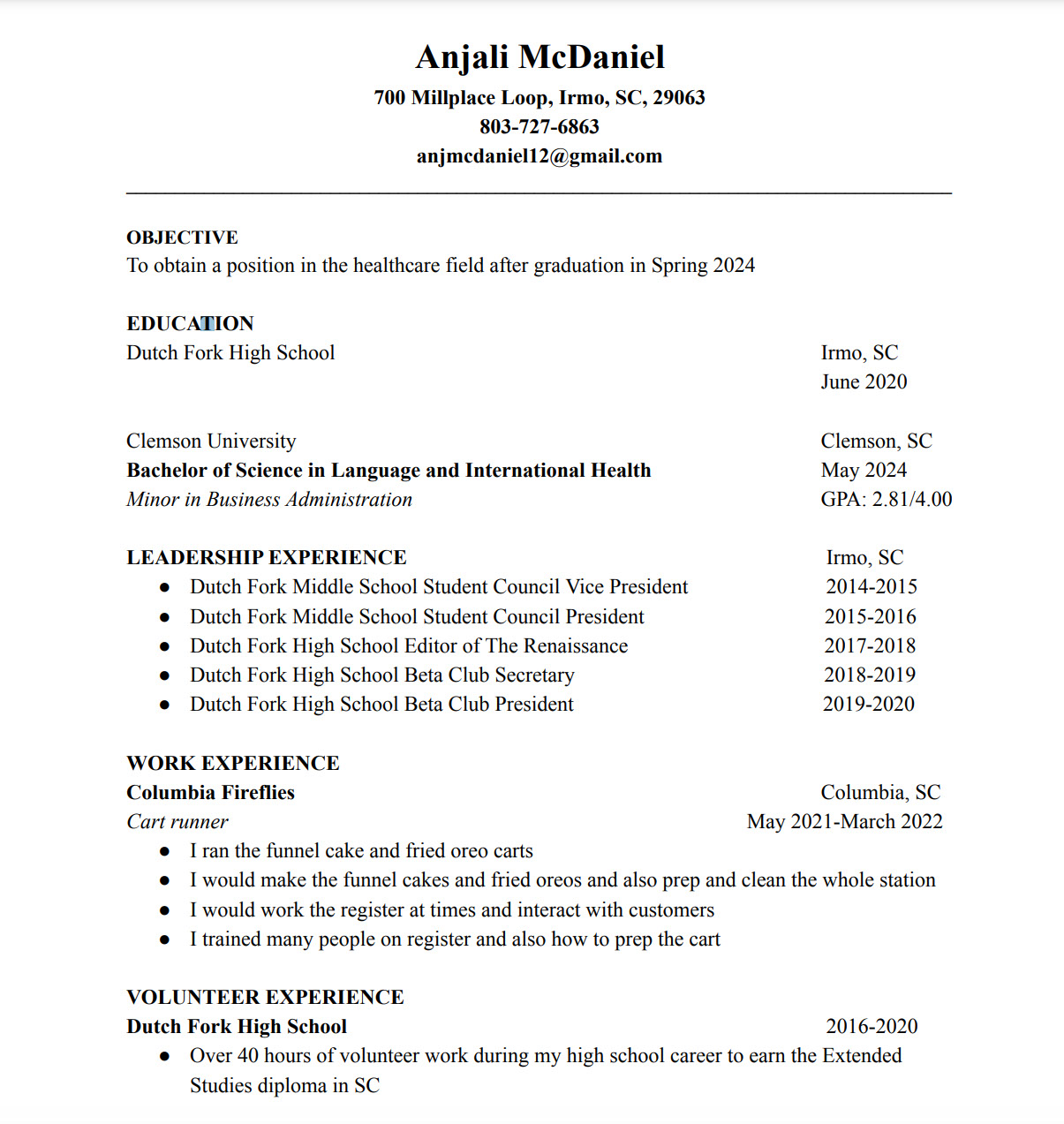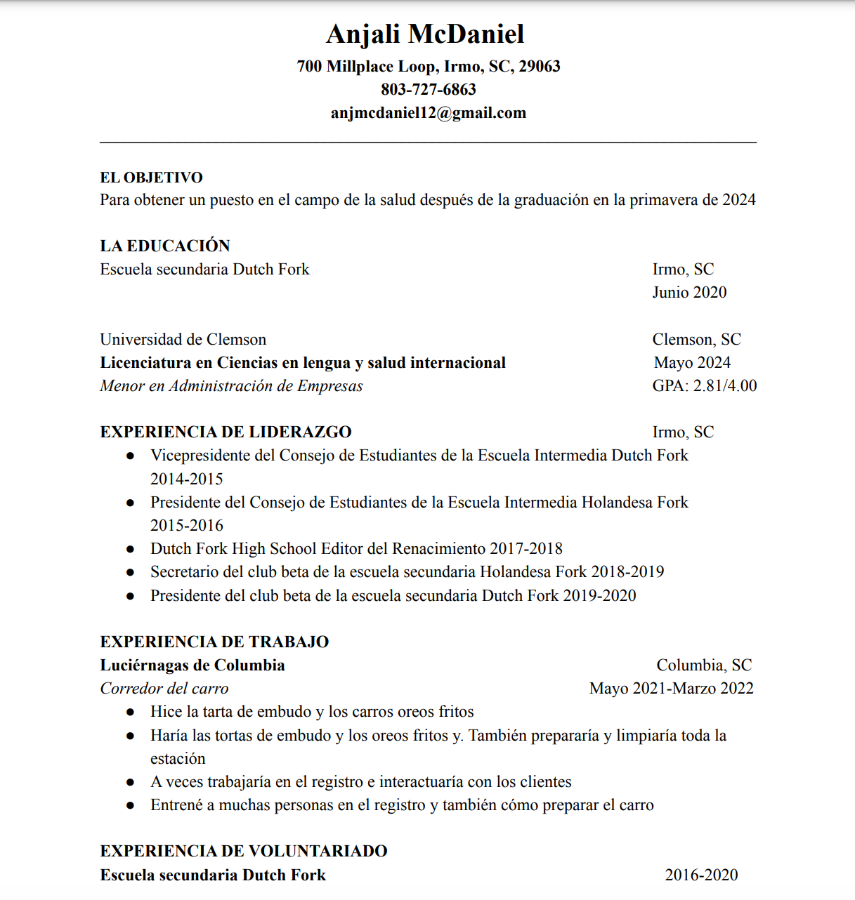Hello! My name is Anjali McDaniel, and I am a senior, Language and International Health Major with an emphasis in Spanish at Clemson University. I am originally from Irmo, SC and I graduated from Dutch Fork High School in May 2020. During my time in high school, I learned about my love for community service and volunteered with many service organizations such as Harvest Hope, Families Helping Families, Walk Like MADD (Mothers Against Drunk Driving), and other great groups. Some of my passions include traveling, spending time with family and friends, writing, hiking, and painting. Since childhood, I have traveled all over the world with my family. I have been to India, London, France, Italy, Switzerland, Germany, and many other countries. Traveling from a young age and gaining my passion for volunteering in my community led me to choose Language and International Health as my major at Clemson University. For a long time, Clemson has been one of my dream schools. I am very lucky to have the opportunity to study here and to find a lifelong career path. I have completed classes such as anatomy and physiology, chemistry, biology, Spanish, and many public health classes such as Global Health, Health Research and Evaluation, Human Health and Disease, and Epidemiology. Through my major, I also had the opportunity to study abroad in Argentina where I went for 6 months and took 18 credit hours of Spanish classes, and also had an internship in both a private and public healthcare center. This experience was very rewarding and helped me gain insight to a new culture and find a passion for the Spanish language. I am now fluent in the language and am excited to continue my journey learning more. I believe the classes that I will complete at Clemson will help prepare me for my postgraduate studies, and I would really like to use what I learn during my time here to help people in the most beneficial way possible! One thing that I really value about my major is that not only did I learn about the medical side of health, but I also learned and experienced the humanities side of healthcare that not many students are exposed to. It is my goal to implement a more humanities aspect to health in my future career and I really feel prepared to do so after studying at Clemson. Thanks for visiting my website! My contact information is below if you have any questions. I hope you enjoy!!