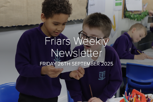 Next week we have a parent and carer phonics workshop on Tuesday afternoon at 2:30pm. This is a welcome to how we teach phonics at Friars and is always a really useful meeting. Please do attend if you received an invite letter.