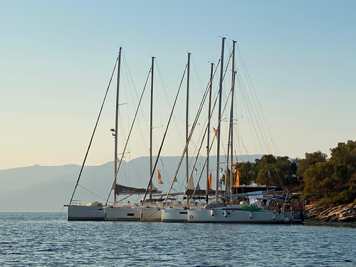 È ancora buio e 4 coppie di fanali rosso-verde si allontanano silenziosamente dalla baia di Skiathos: Pier davanti, segue Markus, poi Adri e chiude la fila Chiara che in questo caso ha nominato come aiutanti un team d’eccezione i ragazzini più grandi della sua barca: Ludo, Cleme ed Edo!