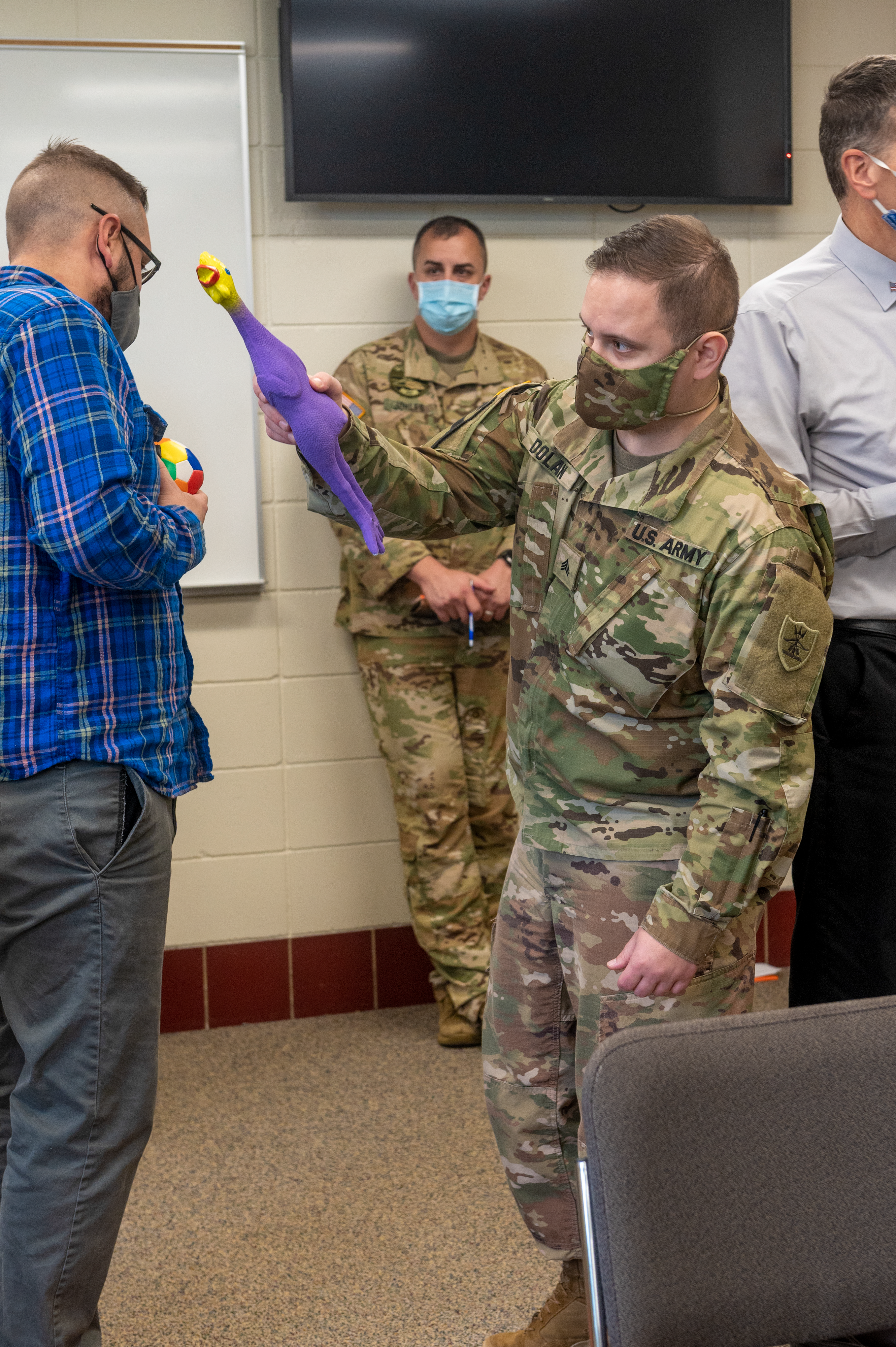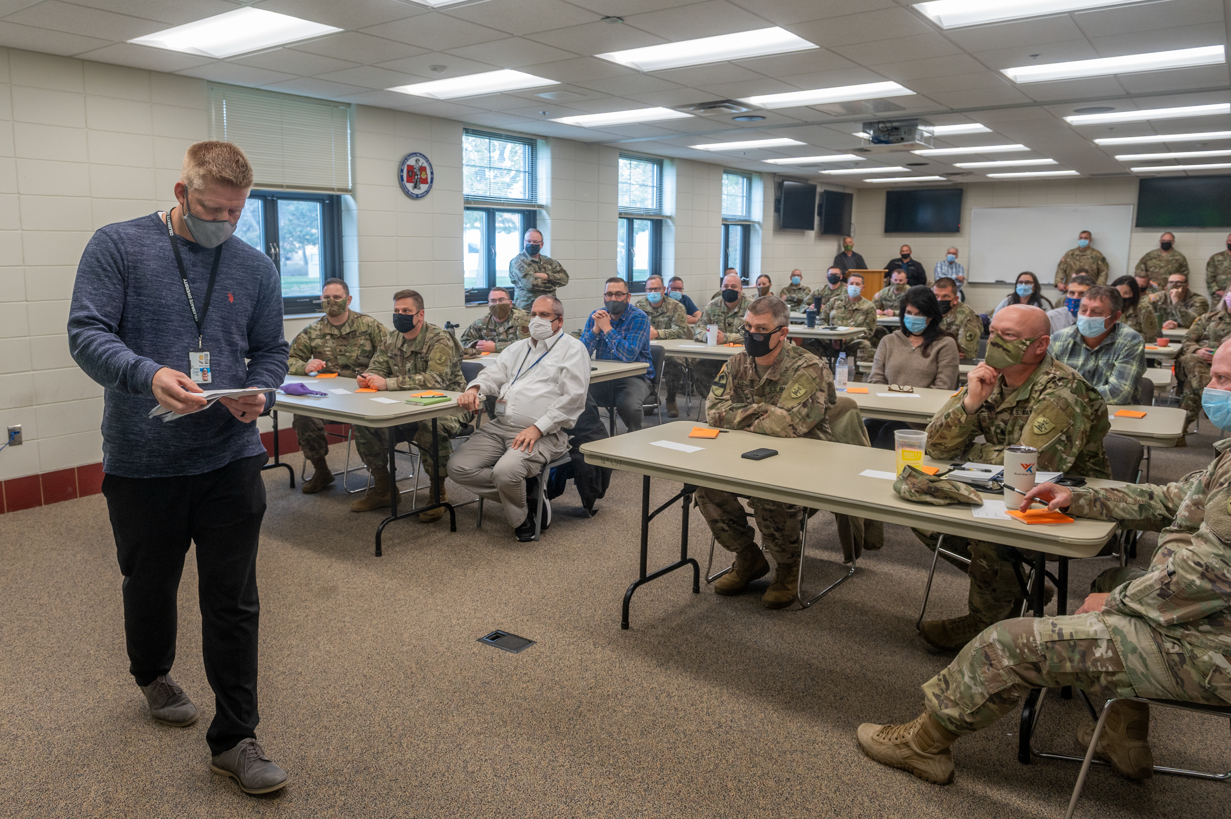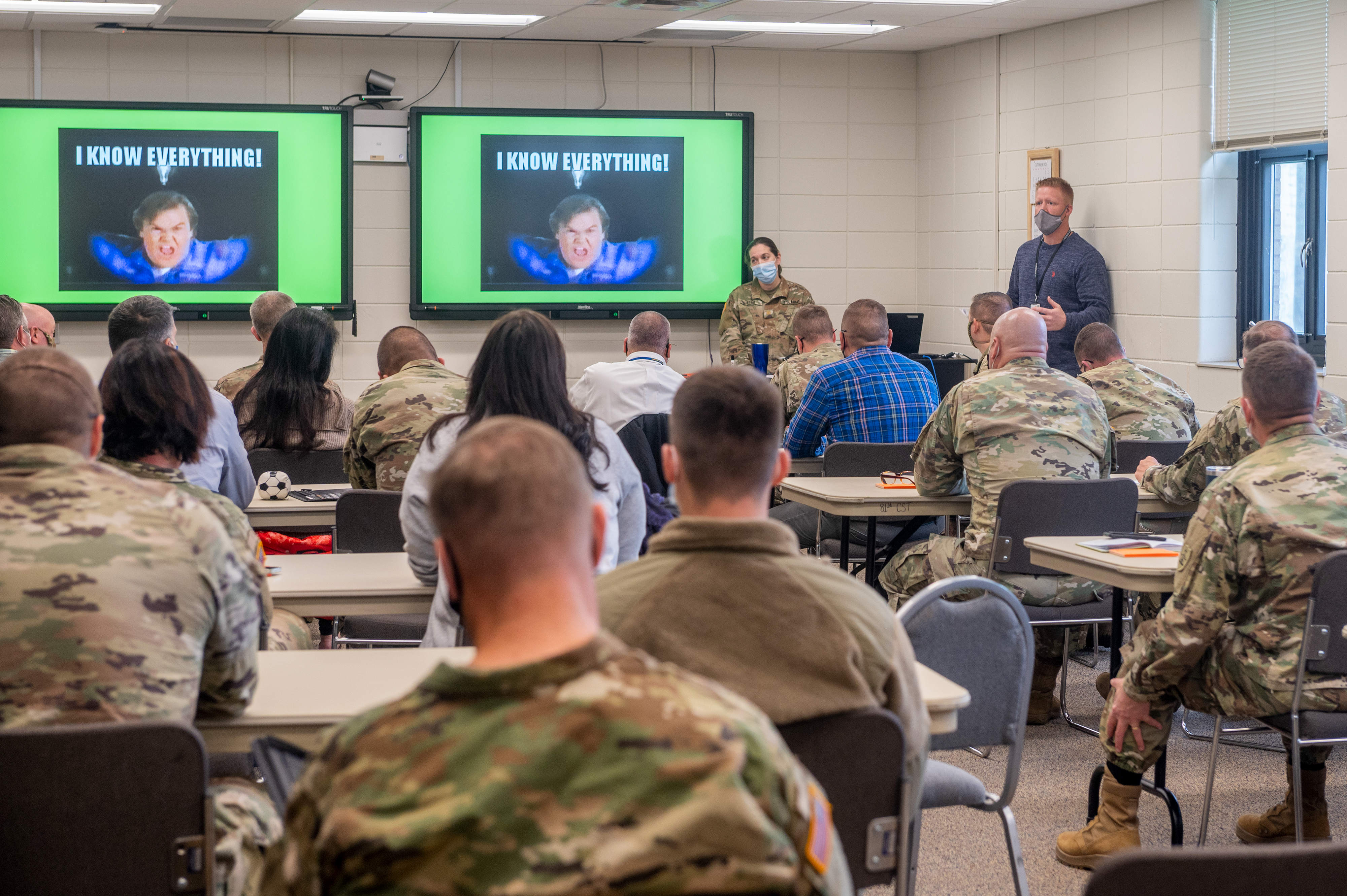 Mr. Robert Roehrich, State Equal Opportunity Manager, and Maj. Rachael Berg, Employee Labor Relations, presented an engaging and informative presentation on ‘The Dangers of Filling in the Blanks,’ at Fraine Barracks in Bismarck, N.D., Nov. 1, 2021. This was the first employee engagement training for the N.D. National Guard full-time staff for the Fiscal Year 2022. The class covered the downfalls of making assumptions and how to improve workplace relationships at all levels of an organization. (Story and photos by Officer Candidate Michaela C.P. Granger, N.D. National Guard Public Affairs Office.)