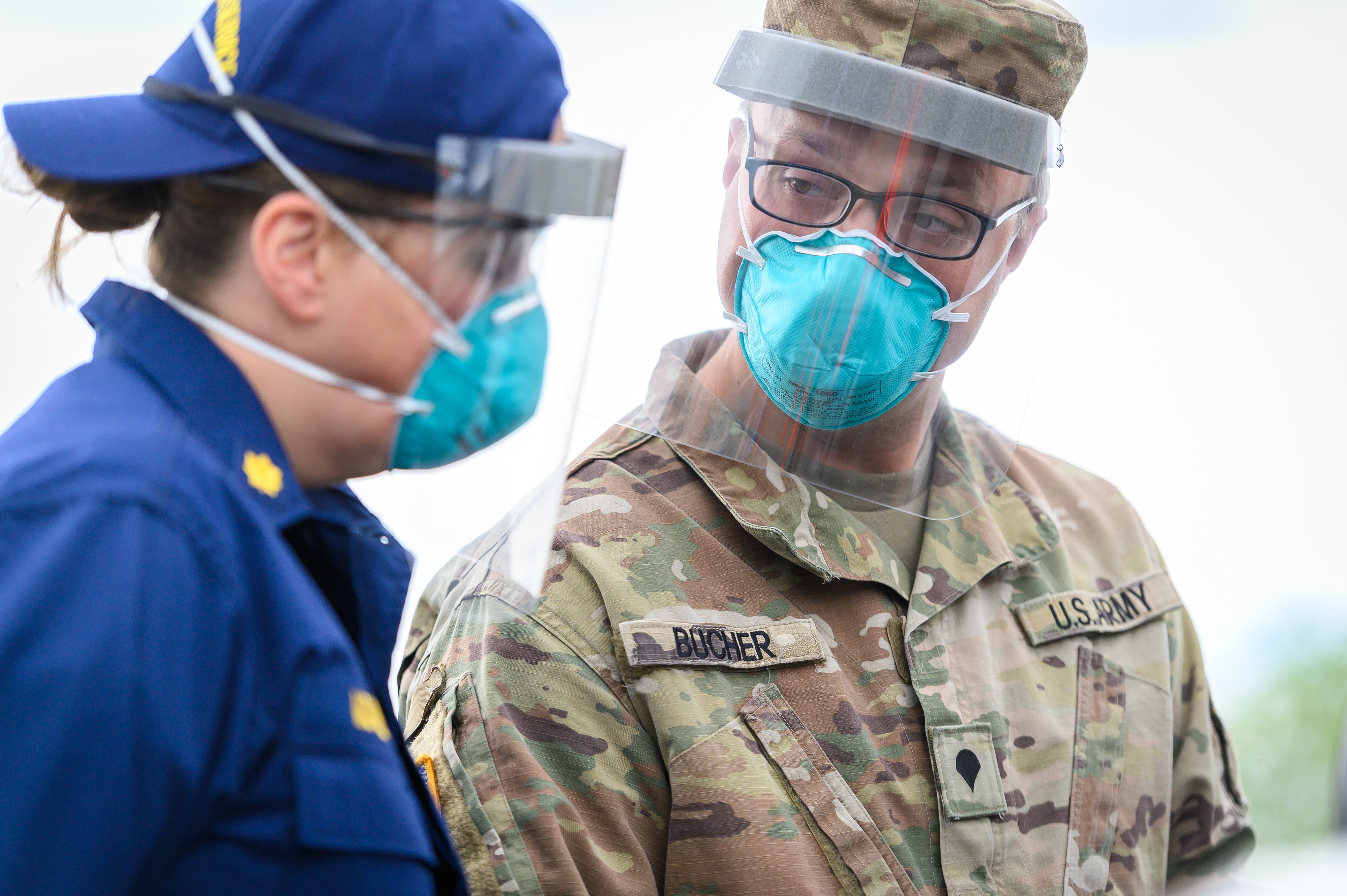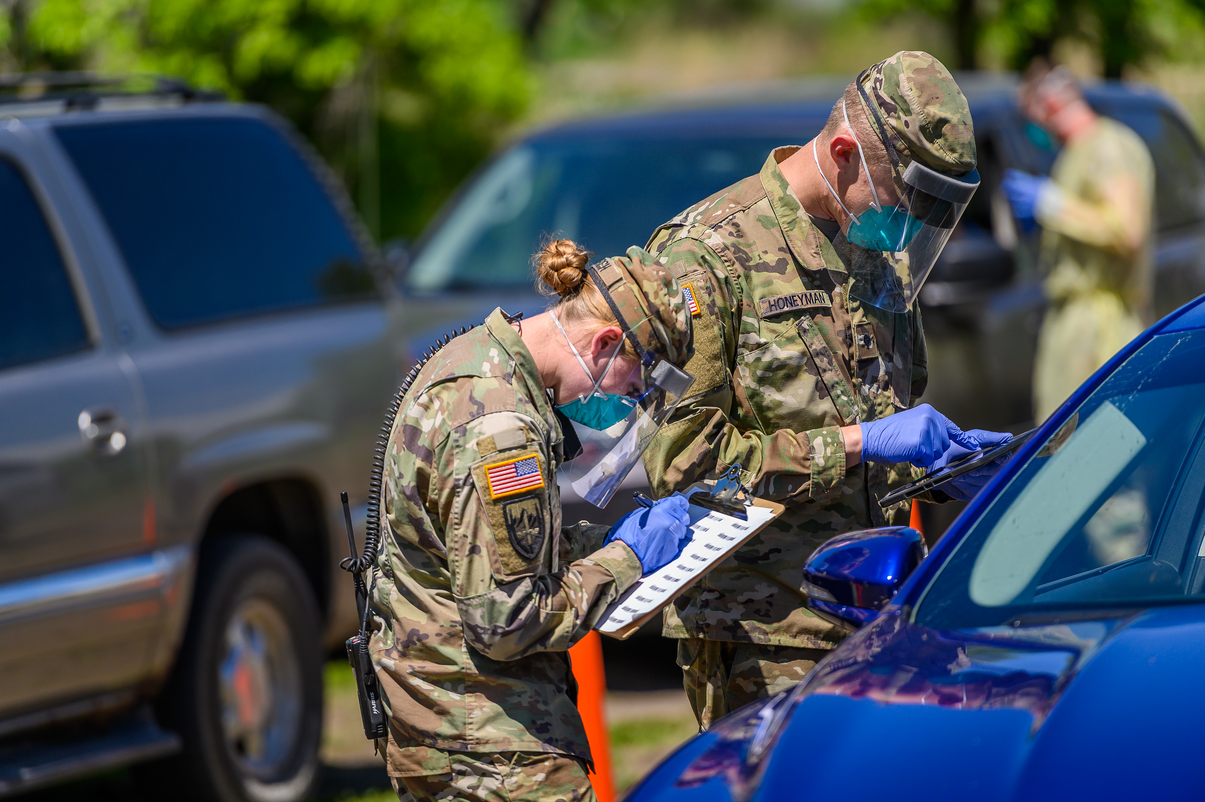 Sgt. Rachel Bakkechurch, 816th Military Police Company, and Spc. Samuel Honeyman, 142nd Engineer Battalion, work as data collectors at the COVID-19 mobile testing site at St. Michael on June 2.