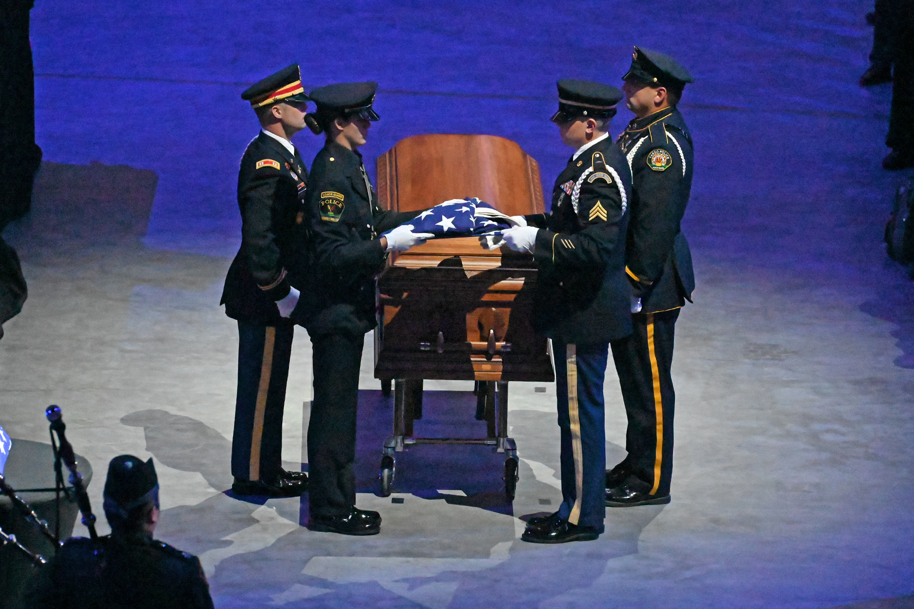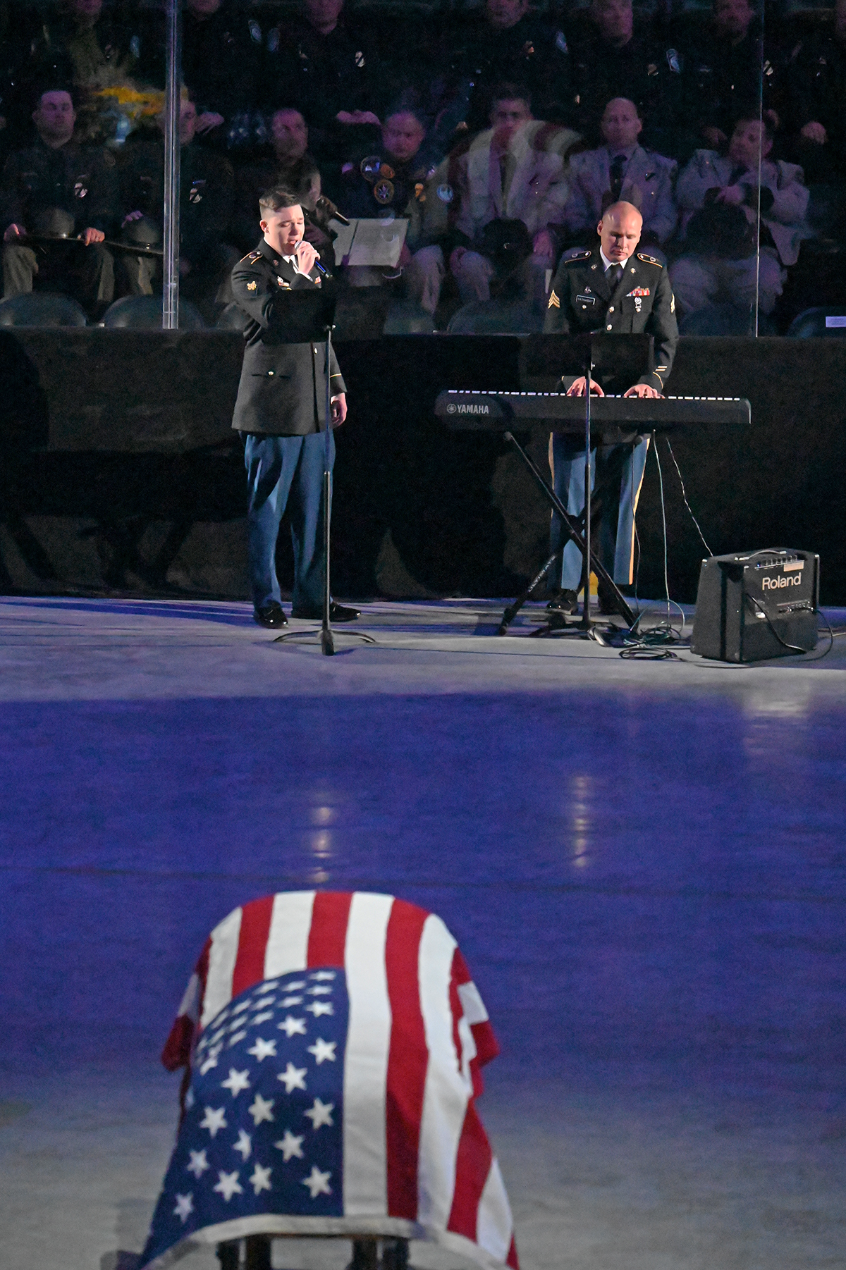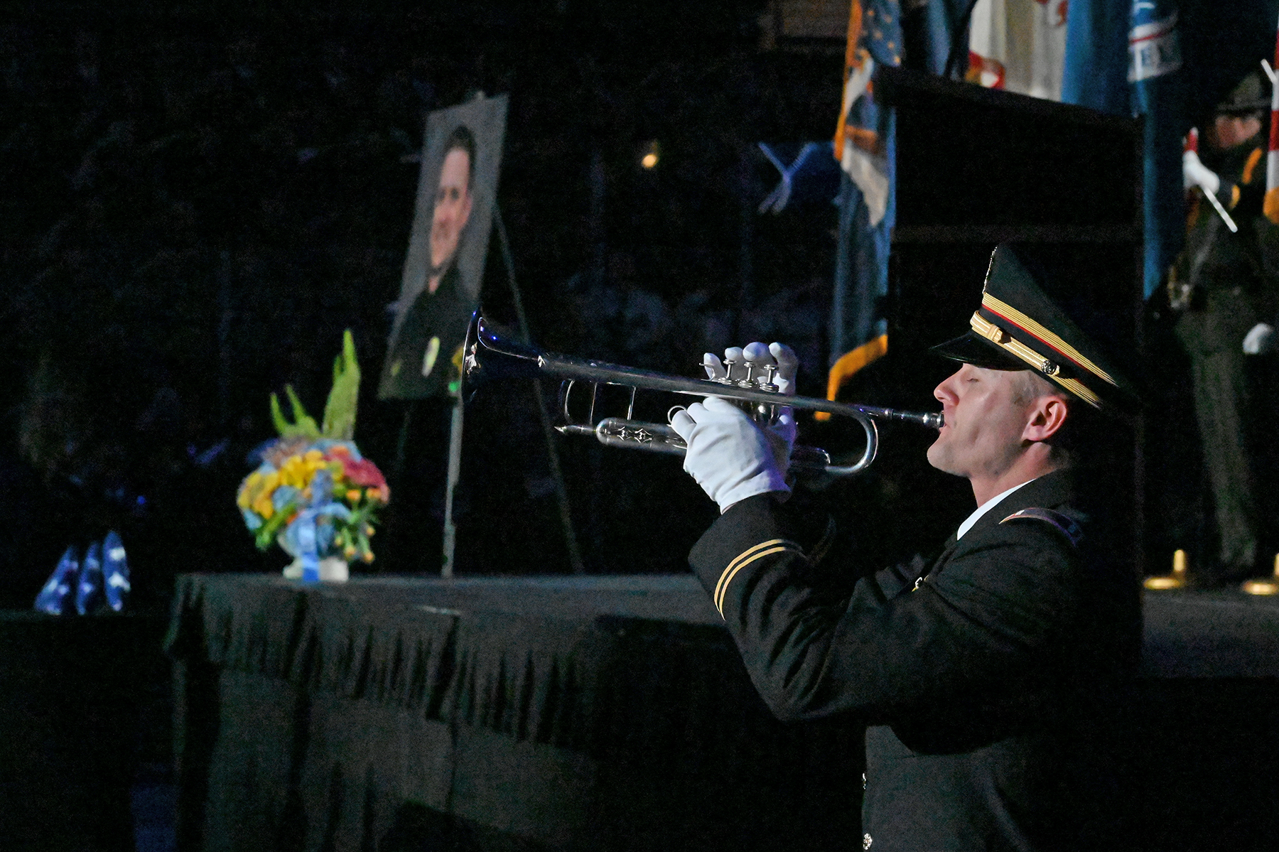 On June 2, Grand Forks Police Officer Cody Holte, 29, was honored in a funeral service at the Ralph Engelstad Arena in Grand Forks that drew thousands of mourners. Holte died in the line of police duty on May 27. He also served in the N.D. Army National Guard as a first lieutenant with the Lisbon-based 815th Engineer Company, Holte was posthumously awarded the N.D. National Guard Legion of Merit and the Woodrow Wilson Keeble “Je Suis Pret” (I am Ready) Award at the prayer service. The Keeble award is earned by N.D. National Guard Soldiers or Airmen who display courage, fortitude, and determination to protect or defend life, limb or property. He was interred at Augustana Church Cemetery near his hometown of Halstad, Minn. Top photo: Chief Warrant Officer 2 James Landman, 188th Army Band, performs Taps during the funeral service.