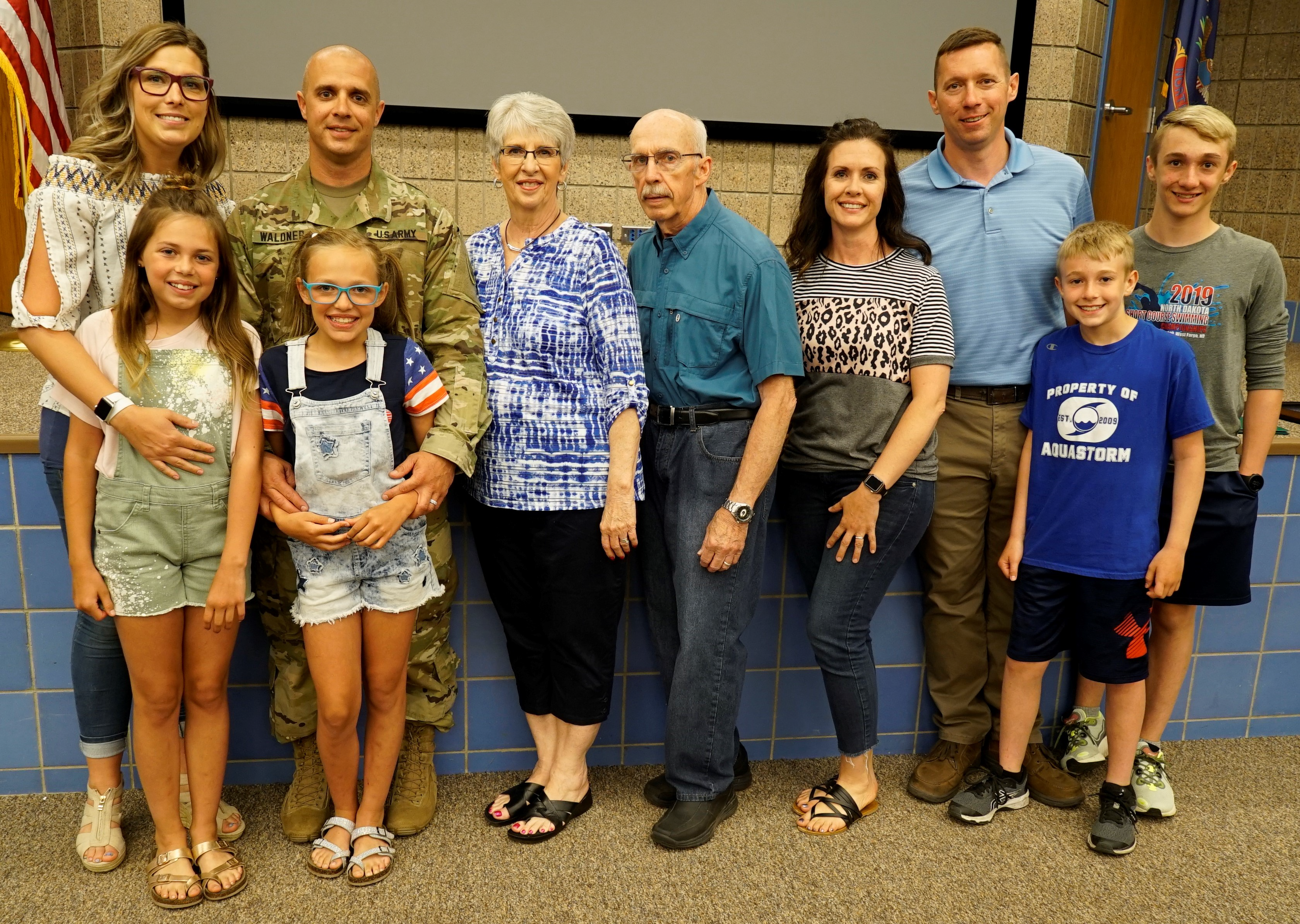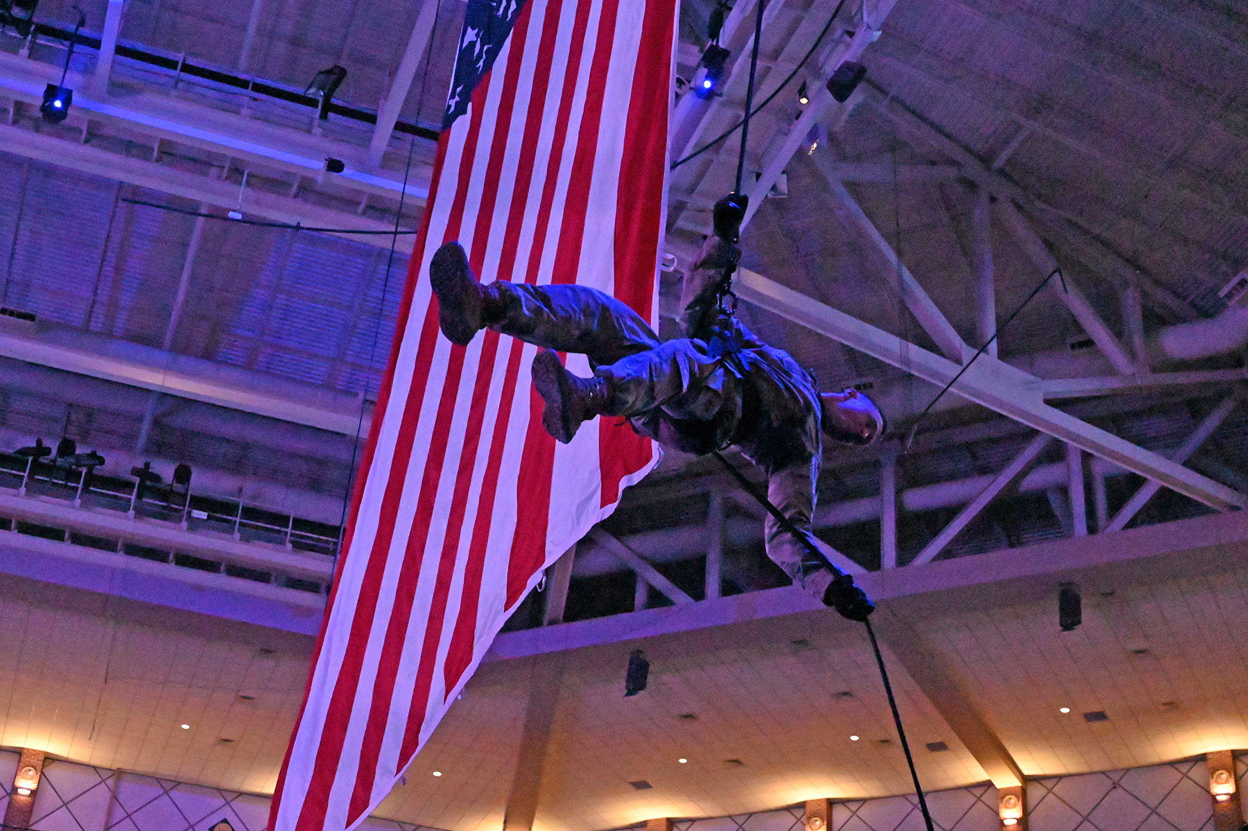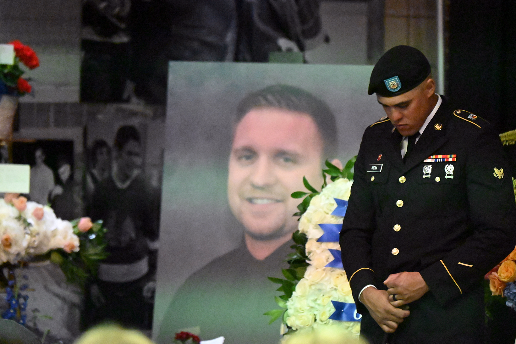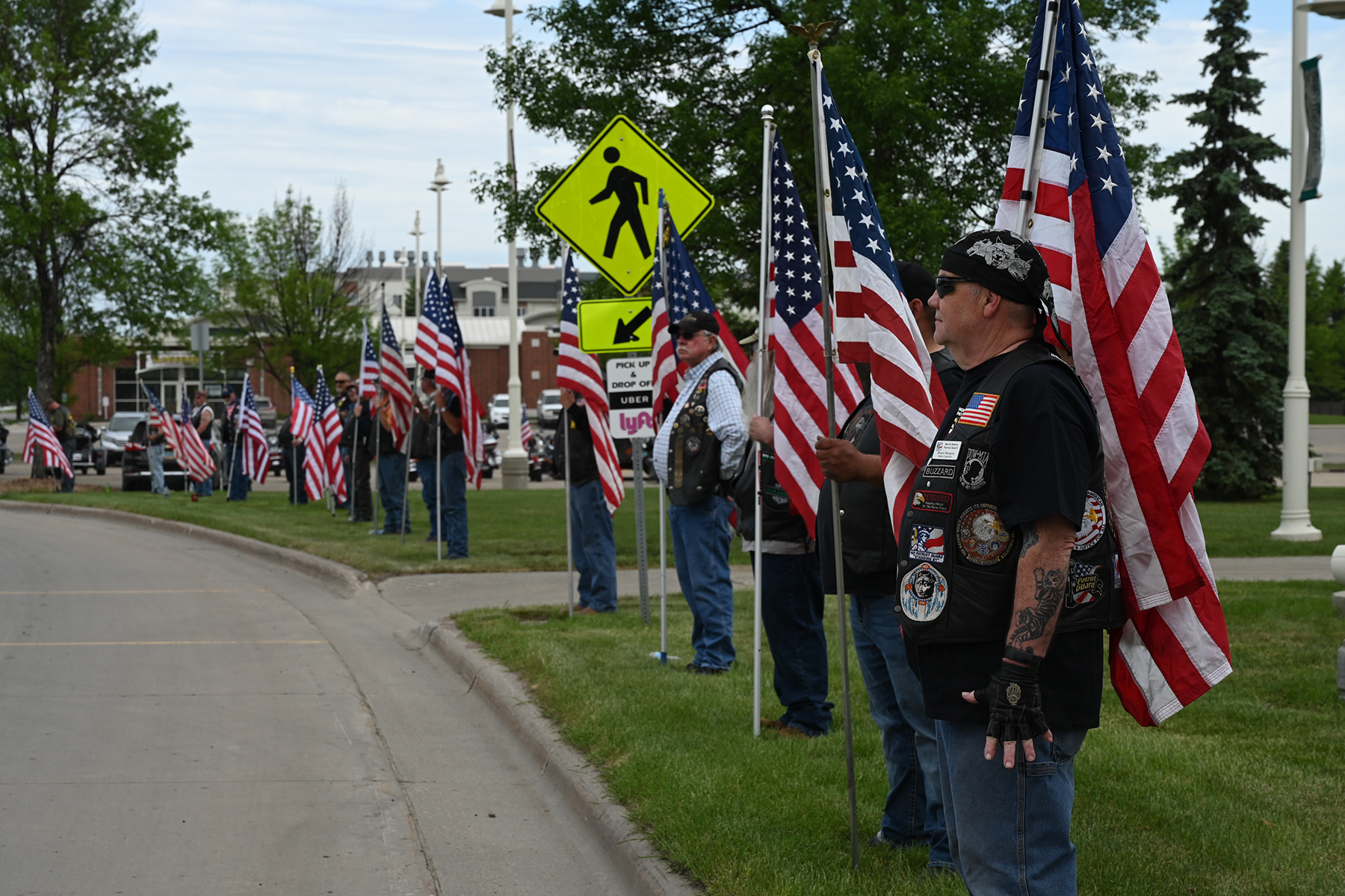 On June 2, Grand Forks Police Officer Cody Holte, 29, was honored in a funeral service at the Ralph Engelstad Arena in Grand Forks that drew thousands of mourners. Holte died in the line of police duty on May 27. He also served in the N.D. Army National Guard as a first lieutenant with the Lisbon-based 815th Engineer Company, Holte was posthumously awarded the N.D. National Guard Legion of Merit and the Woodrow Wilson Keeble “Je Suis Pret” (I am Ready) Award at the prayer service. The Keeble award is earned by N.D. National Guard Soldiers or Airmen who display courage, fortitude, and determination to protect or defend life, limb or property. He was interred at Augustana Church Cemetery near his hometown of Halstad, Minn. Top photo: Chief Warrant Officer 2 James Landman, 188th Army Band, performs Taps during the funeral service.
