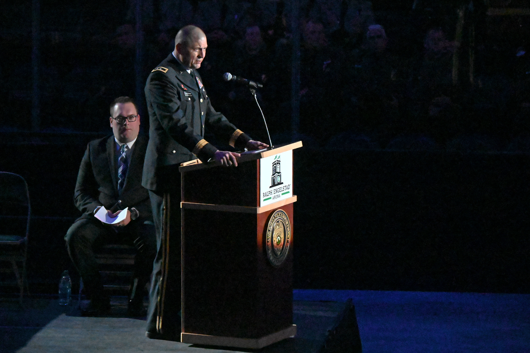 Maj. Gen. Al Dohrmann, N.D. adjutant general, delivers eulogy remarks during 1st Lt. Cody Holte's funeral service in Grand Forks on June 2.