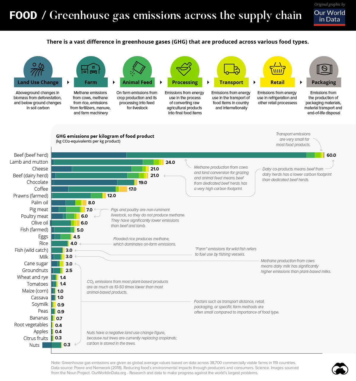 The GHG emissions of nutrition add up from emissions along the value chain. Although the steps behind the supply chain for individual foods can vary considerably. Sometimes Landuse change, Farm and Animal Feed are used as single steps. In other data its combined under Agricultural production. Roughly, the value chain consists of these steps: