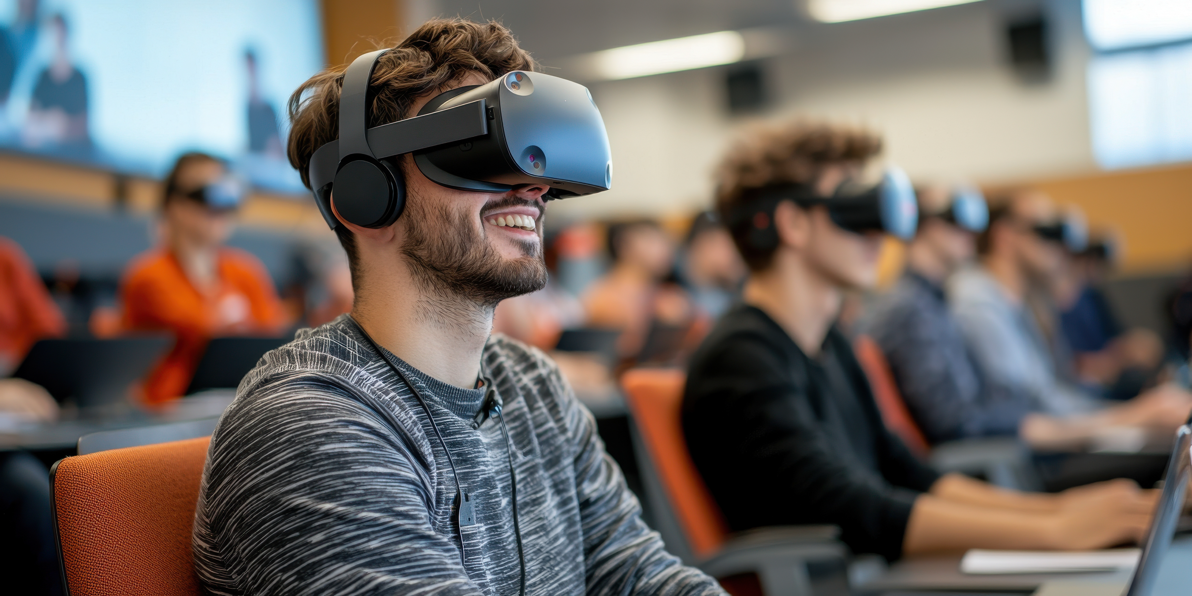 Created with images by Sergey Nivens - "Man in virtual helmet . Mixed media" • nunoi - "A group of students engages in virtual reality learning in a modern classroom setting, showcasing technology in education." • Gorodenkoff - "Factory: Female Industrial Engineer Wearing Virtual Reality Headset and Holding Controllers, She Uses VR technology for Industrial Design, Development and Prototyping in CAD Software." • pisan - "Experience the future of higher education with our next-gen online university platform, offering real-time immersive VR classrooms Embrace the digital learning evolution and explore futuristic" • Anat art - "Colorful 3D avatars connected by glowing lines illustrate digital social interactions in a vibrant virtual space. Generative AI" • fizkes - "Excited young african american man wearing virtual reality glasses." • christianchan - "What is Next Concept On Sticky Note"