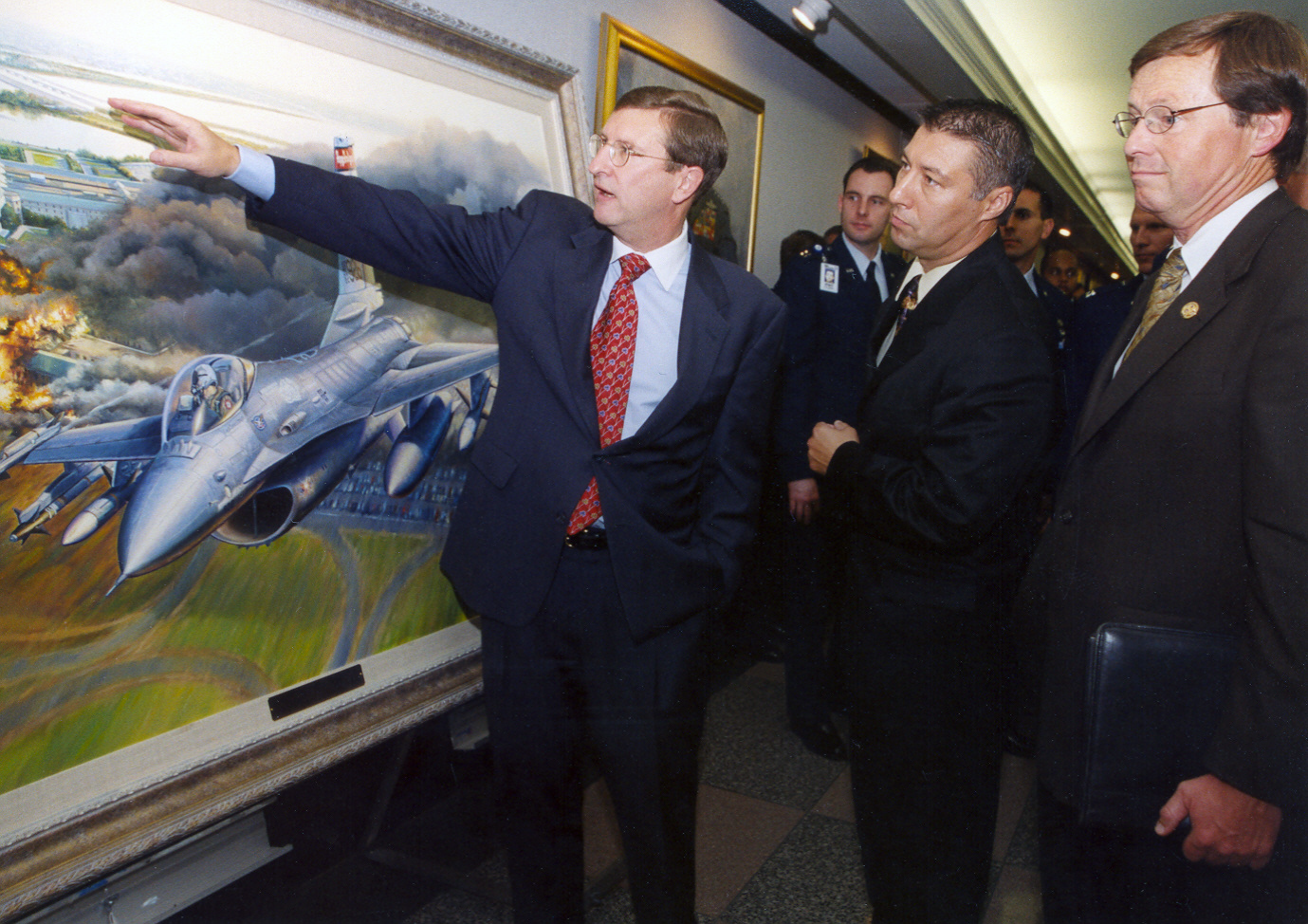 Maj. Dean Eckmann, a 119th Fighter Wing pilot, right, stands with artist Rick Herter, in front of a painting depicting Eckmann flying over the Pentagon following the terrorist attack in Washington, D.C. on September 11, 2001. The painting, called ‘First Pass, Defenders Over Washington,’ was unveiled for display in corridor 9 of the Pentagon on Sept. 4, 2002.