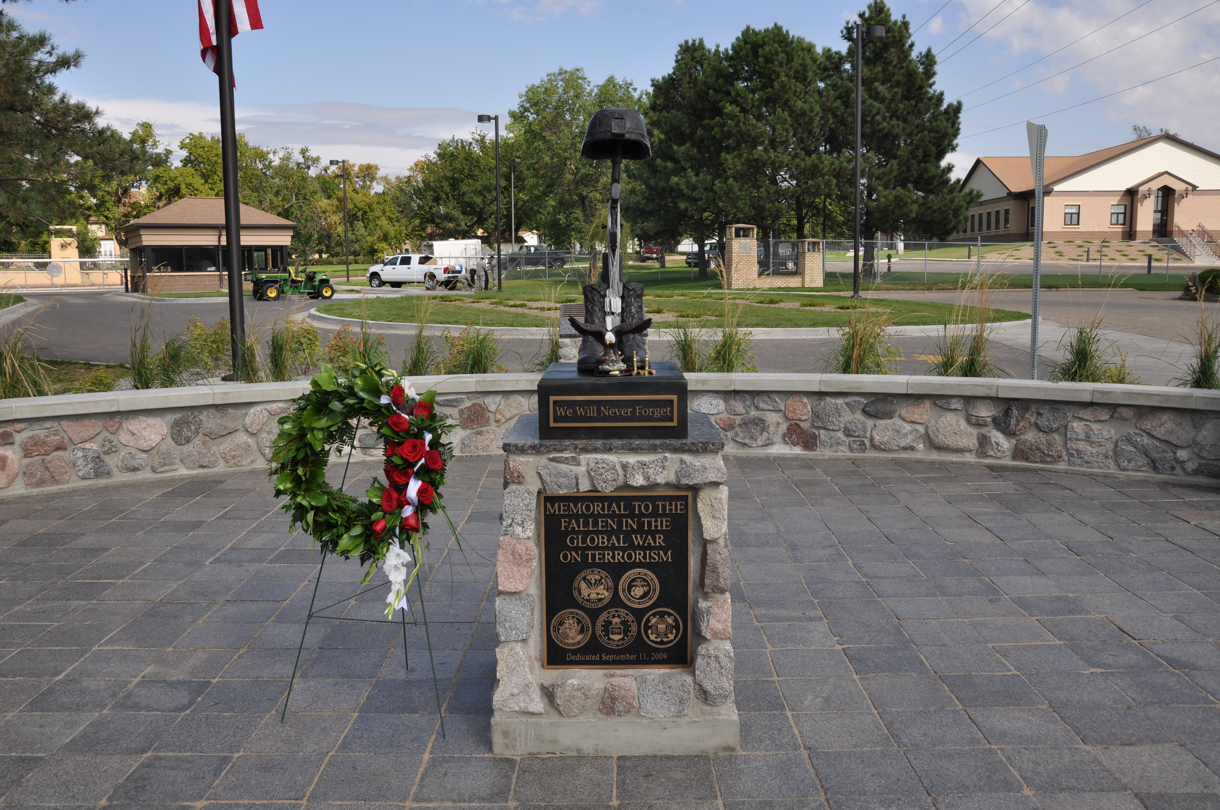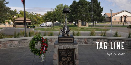 Top photo: A wreath, dog tags and empty shells adorn the North Dakota Memorial to the Fallen in the Global War on Terrorism at its dedication on Sept. 11, 2009. The memorial is located at the front gate of Fraine Barracks, the N.D. National Guard headquarters, in Bismarck, N.D. This joint venture of the city of Bismarck and the National Guard honors 28 North Dakotans, of which fourteen are N.D. National Guard Soldiers. (Photo by Chief Warrant Officer 3 Kiel Skager, N.D. National Guard Visual Information)