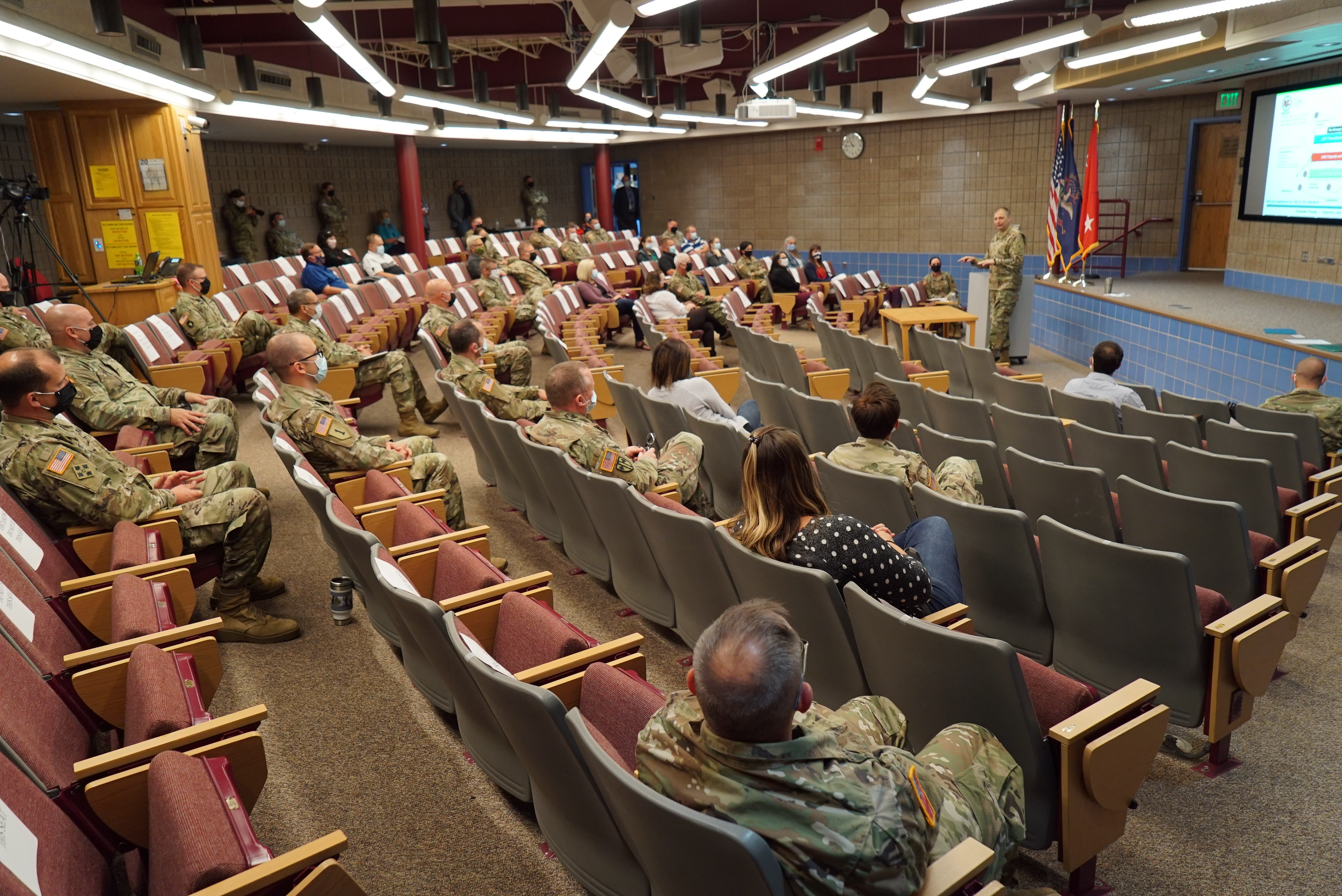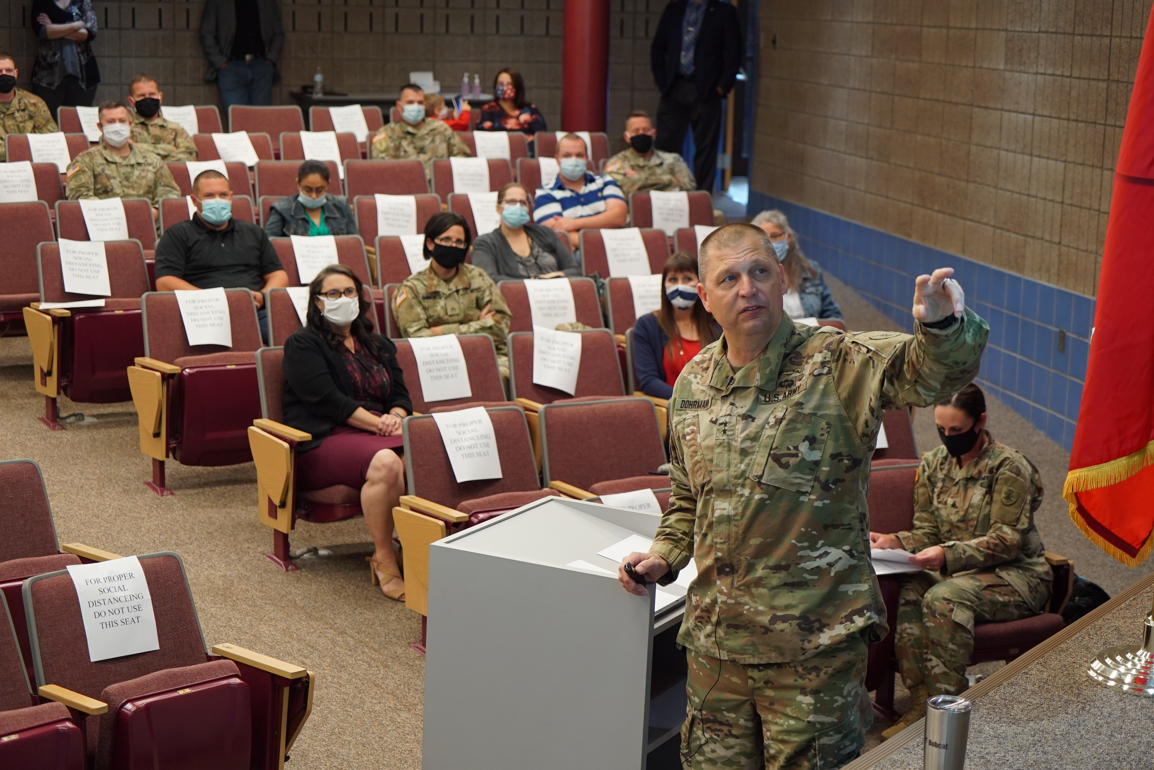 Maj. Gen. Al Dohrmann, N.D. Adjutant General, conducted a town hall briefing at the Raymond J. Bohn armory in Bismarck on Sept. 11, 2020. The purpose was to provide a strategic update to the full time staff (N.D. Department of Emergency Services, N.D. State Radio, and state employees of the N.D. National Guard) in the western portion of the state and to recognize top performing personnel. This is part of a series of town halls done in three geographically separate areas across the state. The town hall was also streamed so employees not present could still hear Dohrmann's message.