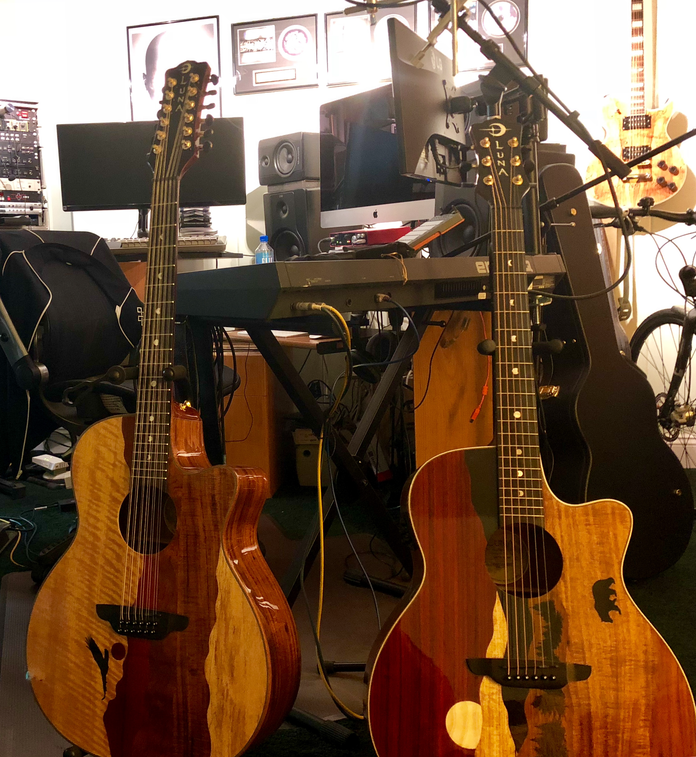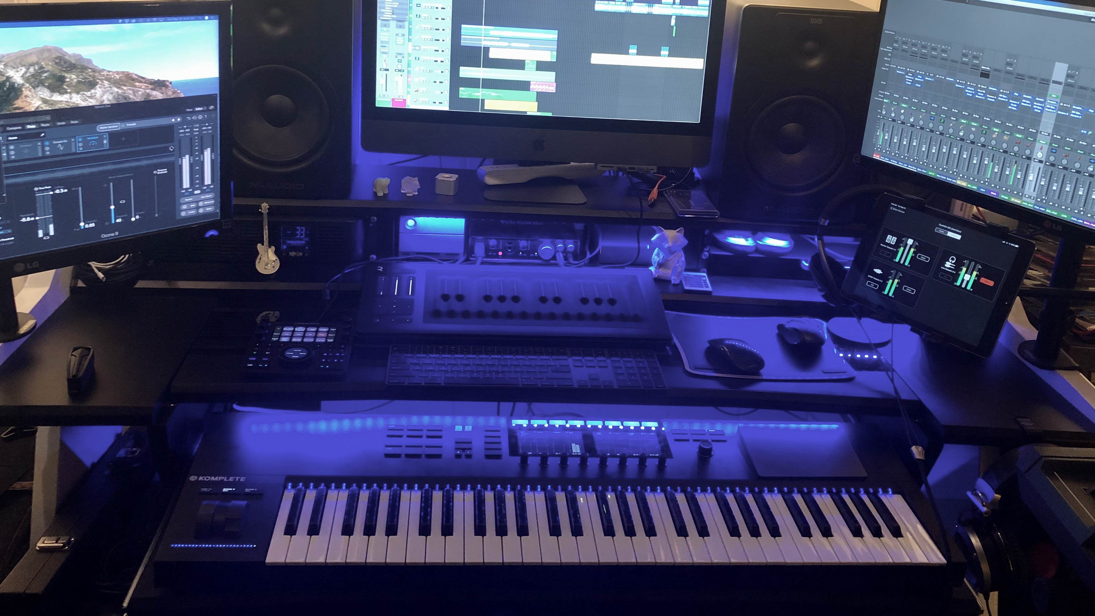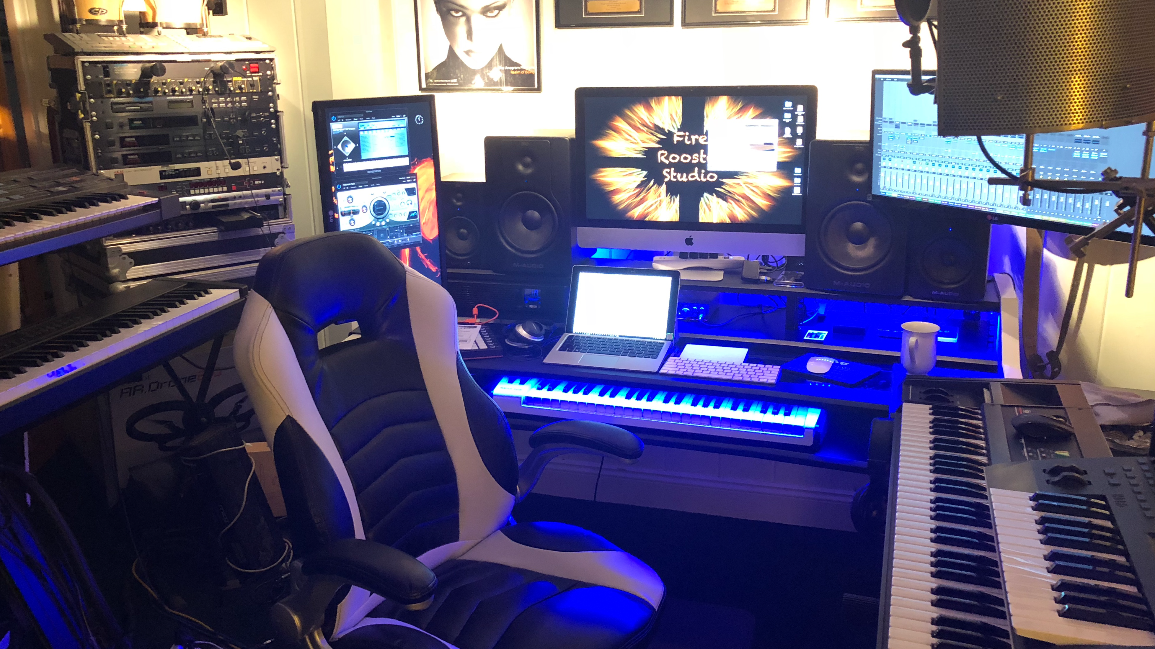 A 27" 5k iMac Pro - 3GHz 10-core Intel Xeon X processor with 64 GB Ram and Radeon Pro Vega 64x 16 Gb on board. MacOS with Logic Pro X & Albeton Live 10 with Native Instruments Komplete Kontrol S61 and Novation 64 Impulse controllers. My interface is a Presonus STUDIO 192 with M-Audio BX5 & BX8 monitors. Vocals are recorded using an Aston Spirit microphone with Aston Halo isolation shield and a RODE NT1-A Microphone with sE isolation panel.
