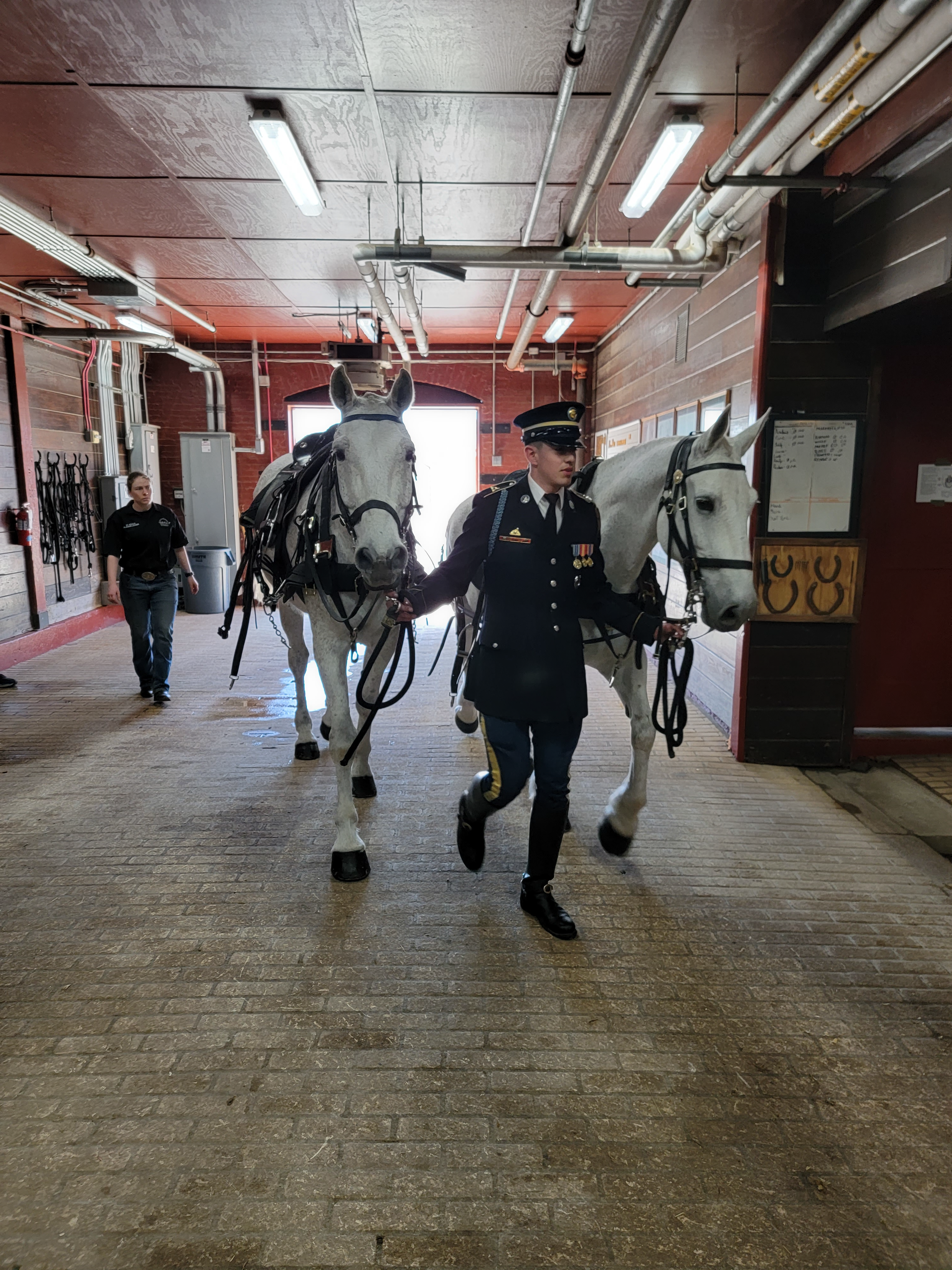 A Soldier from the Caisson platoon of the "The Old Guard", leading in two of the horses after a funeral mission, Arlington National Cemetery Washington D.C., April 22, 2022.