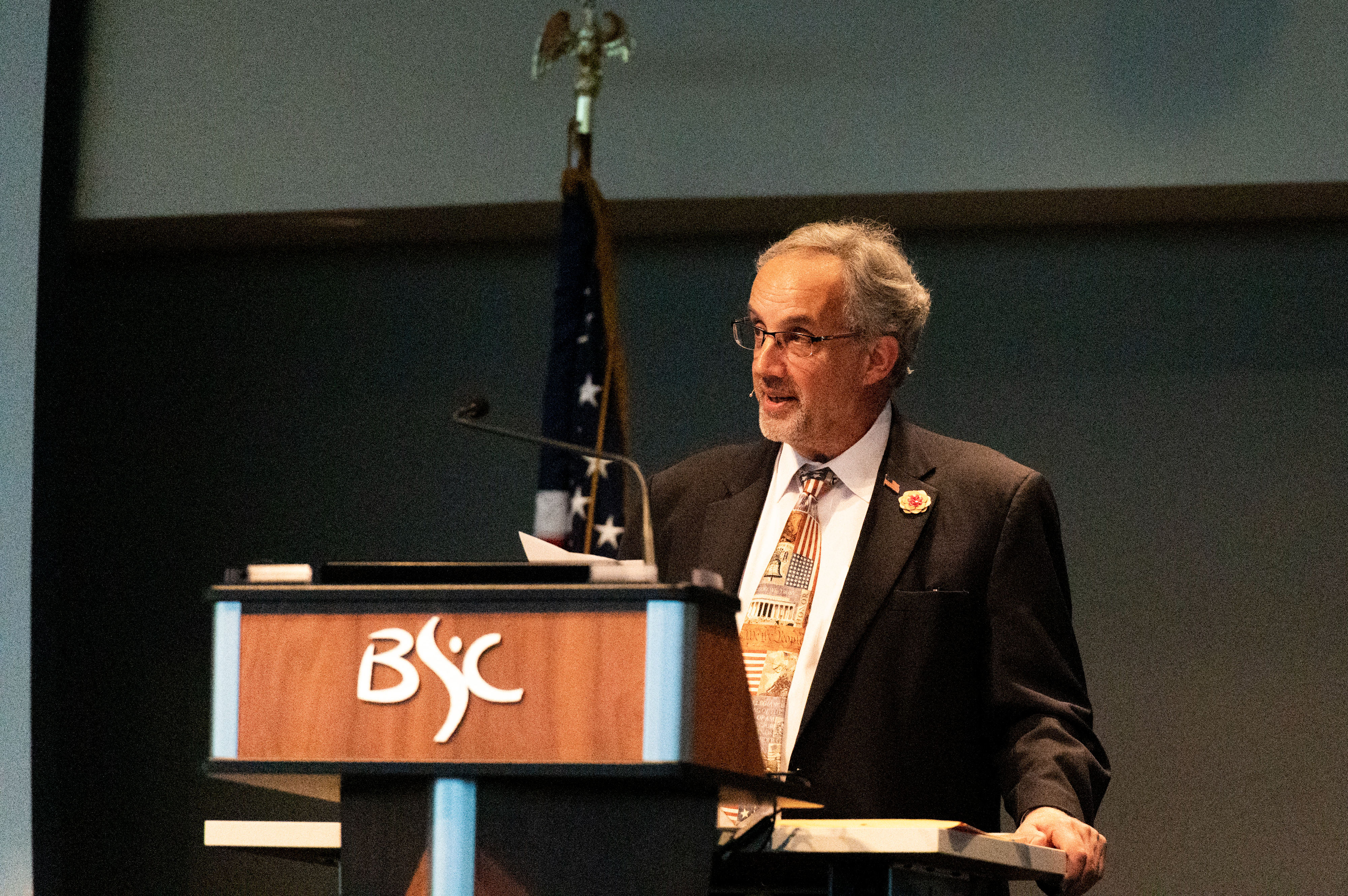 George Luz Jr. spoke about his memories of his father and the famed Easy Company, Band of Brothers mini-series, at Bismarck State College, May 2, 2022. (National Guard story and photos by Staff Sgt. Sam Kroll, N.D. Visual Information Office)