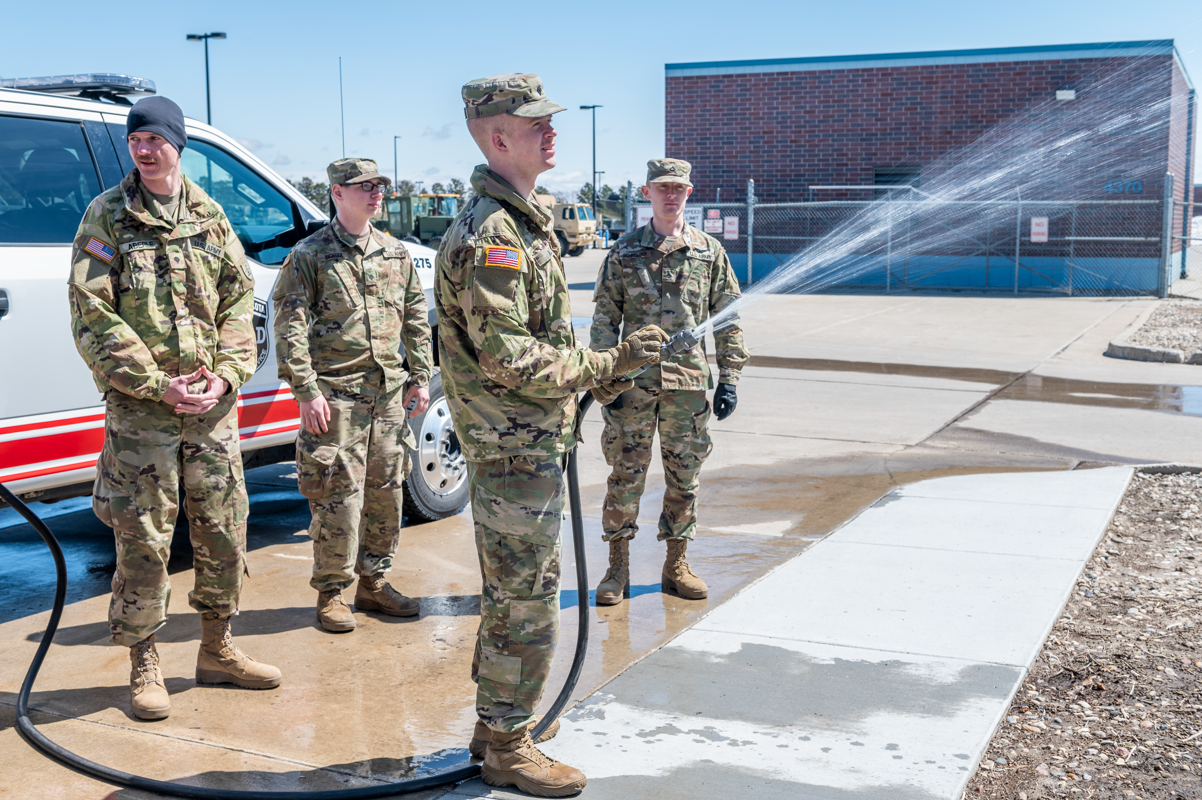 Pfc. Grant Skager trains on how to adjust the nozzle of the hose during wildland firefighter certification at Raymond J. Bohn armory in Bismarck, May 1, 2022. (National Guard photos by Officer Candidate Michaela C.P. Granger, N.D. Natioanl Guard Public Affairs Office)