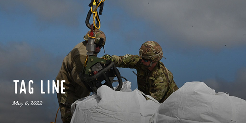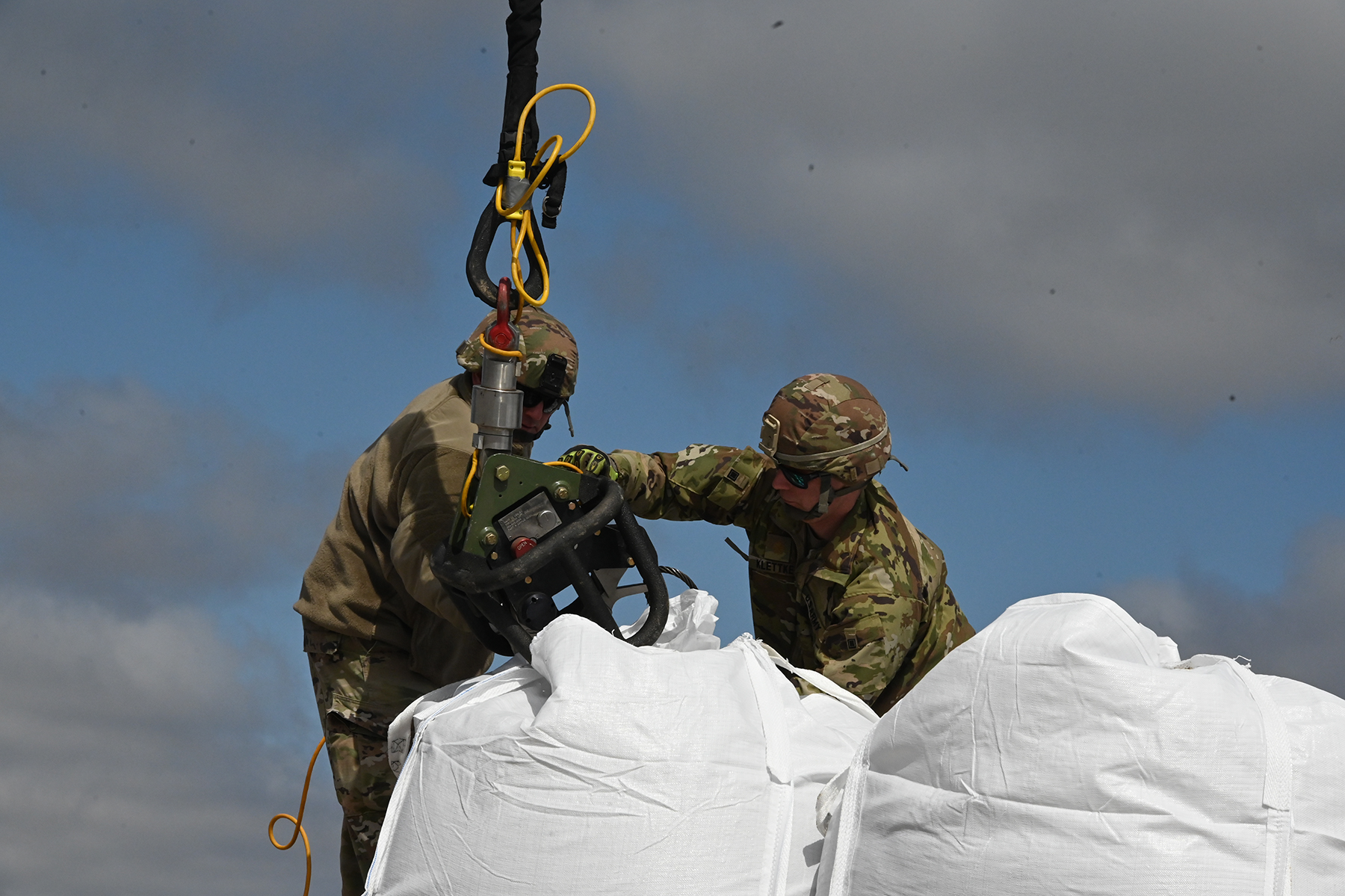Command Sgt. Maj. Kenneth Kachena, left, and Maj. Lucas Klettke, both of the 141st Maneuver Enhancement Brigade, hook up one-ton sandbags to a cable suspended from a Black Hawk helicopter, Pembina County, May 3, 2022. Gov. Doug Burgum authorized the N.D. National Guard to dispatch two UH-60 Black Hawk helicopters to help stabilize the Bourbanis Dam. (National Guard photo by Master Sgt. Mike Knodle, 119th Wing)