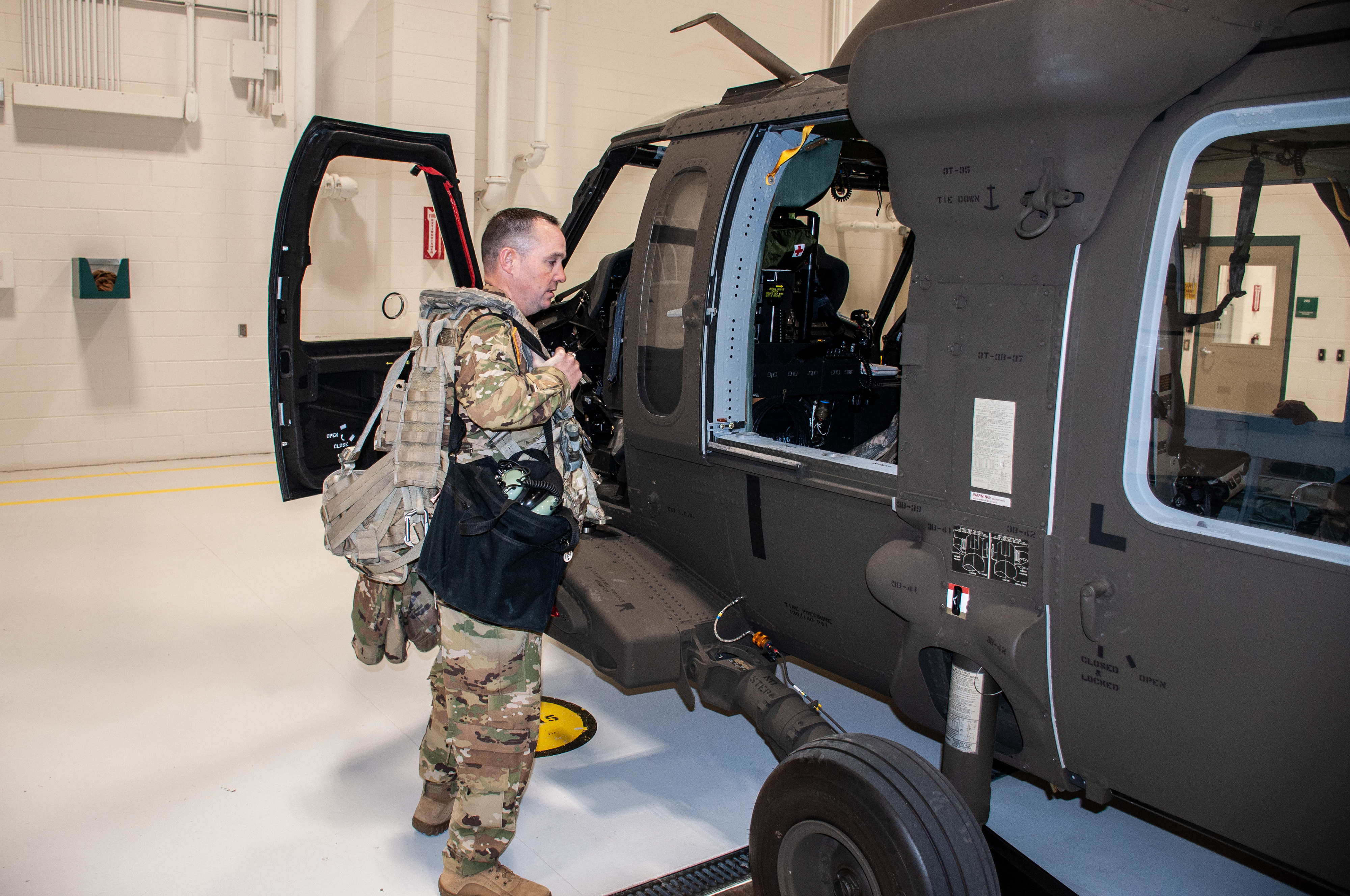 N.D. National Guard crew chief 1st Sgt. Mitch McCoy, Company C, 2nd Battalion, 285th Aviation Regiment, executes pre-flight checks for his Uh-60 Black Hawk helicopter at the Guard's Army Aviation Support Facility, Bismarck, N.D. May 3, 2022. (National Guard photo by Bill Prokopyk, N.D. National Guard Public Affairs Office)