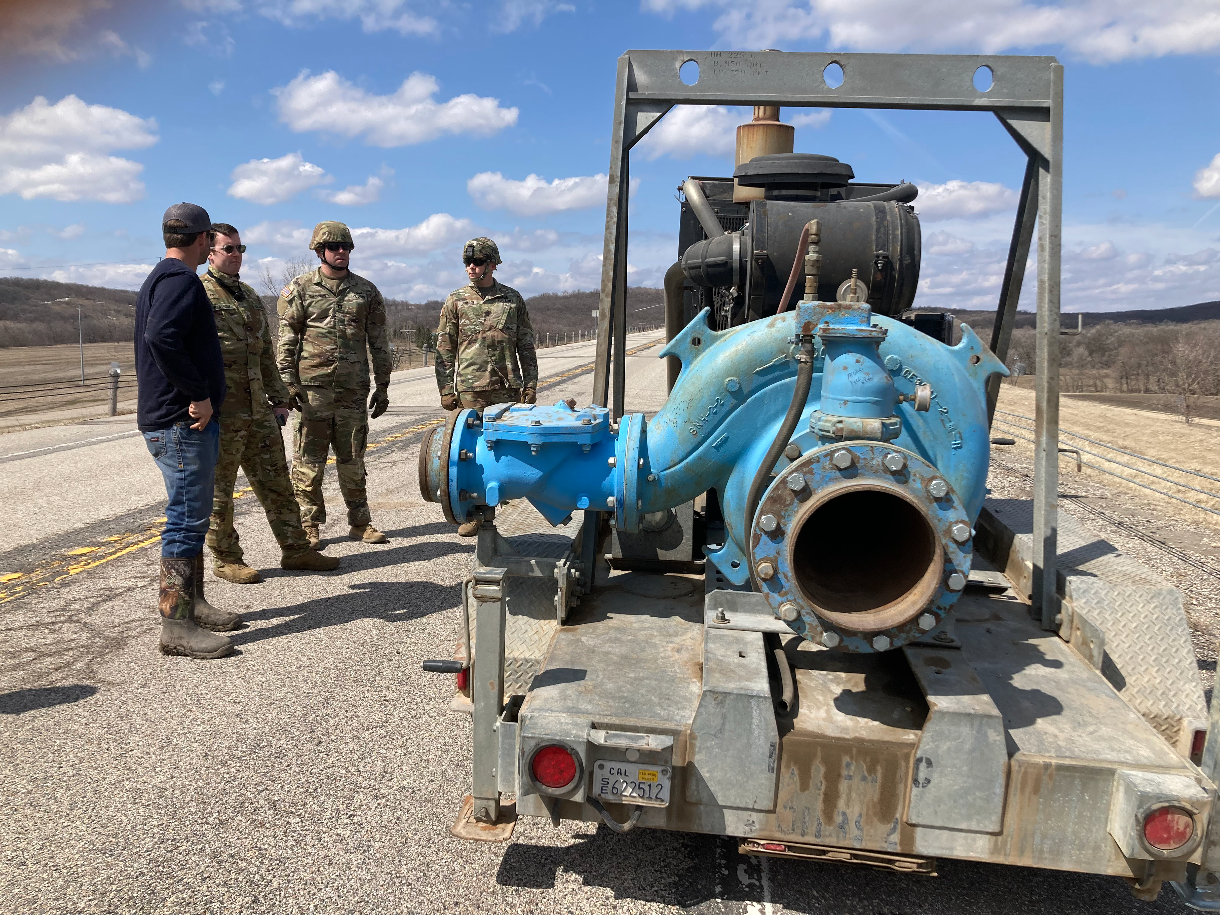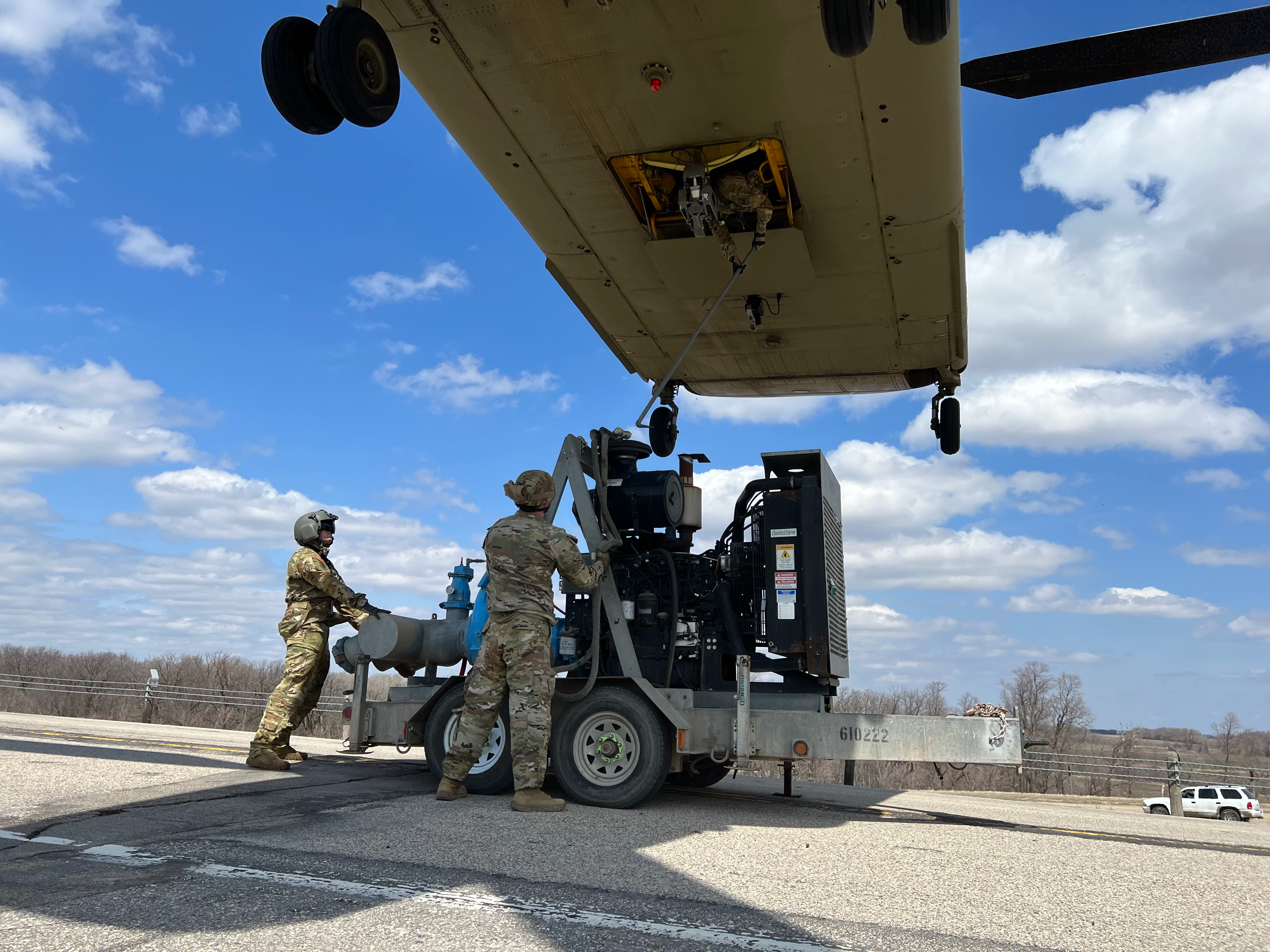 A CH-47 Chinook from the St. Cloud, Minnesota-based Company B, 1st Battalion, 171st Aviation Regiment (GSAB), assisted by North Dakota Soldiers on the ground, placed two water pumps, leased from a private contractor, into locations designated by the Pembina County Water Resource District. The pumps can process 4,000 gallons per minute and were strategically placed to relieve pressure on the dam.