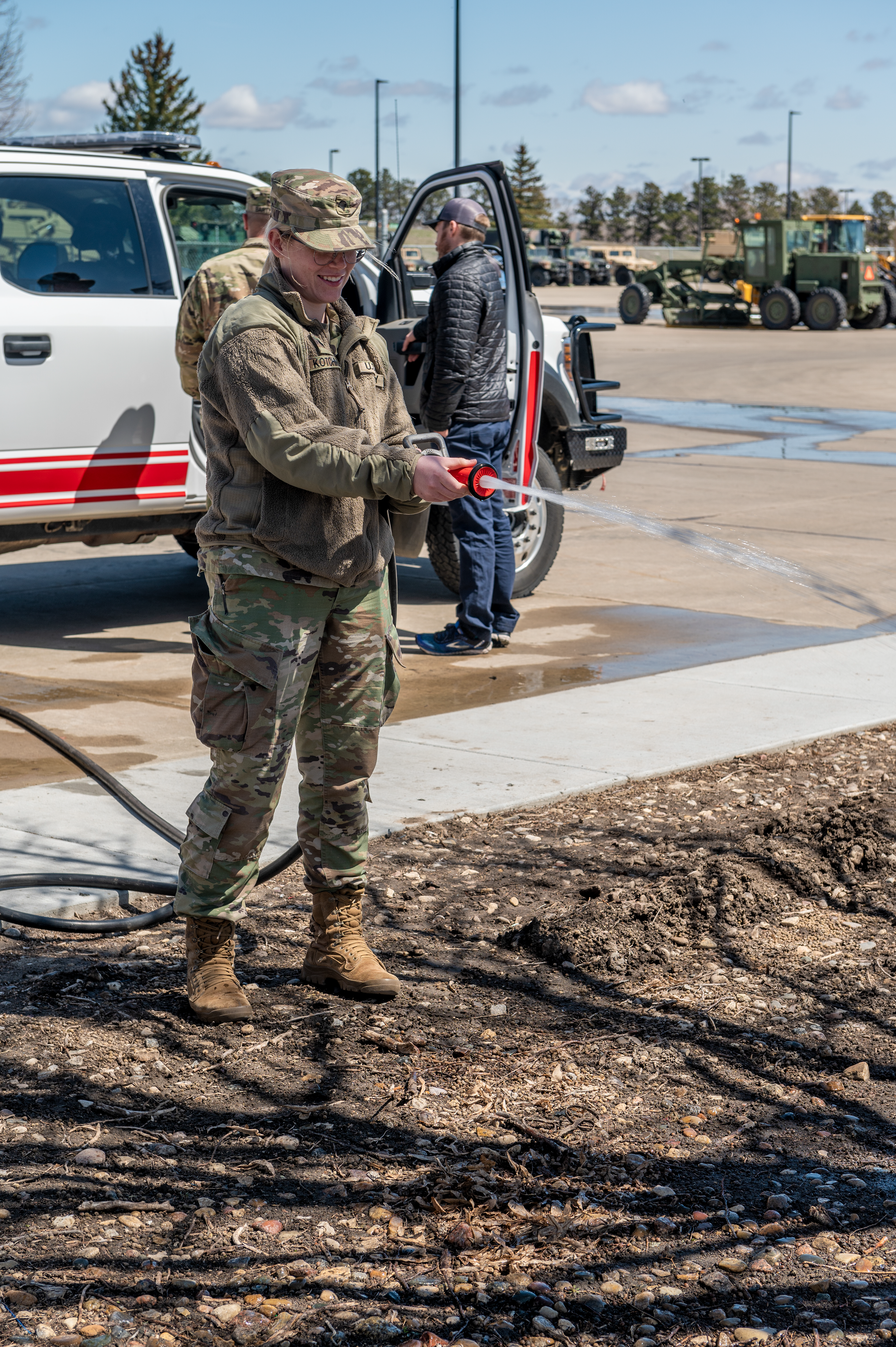 Spc. Matthew Aberle adjusts the nozzle of the hose during wildland firefighter certification training at Raymond J. Bohn armory in Bismarck, May 1, 2022. (National Guard photos by Officer Candidate Michaela C.P. Granger, N.D. National Guard Public Affairs Office)