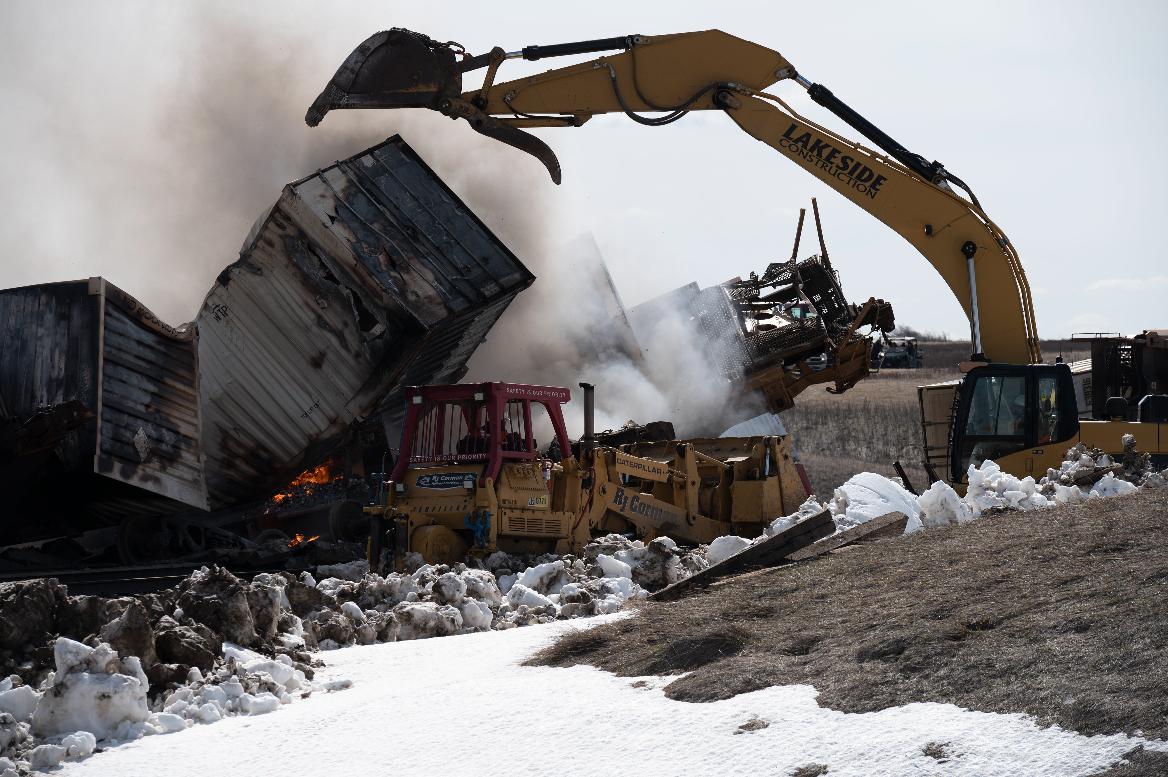 The Burlington fire chief requested fire suppression assistance at the scene of a train derailment near Des Lacs, North Dakota. Due to the muddy conditions, the Burlington Fire Department's trucks had difficulty getting close to the fire.