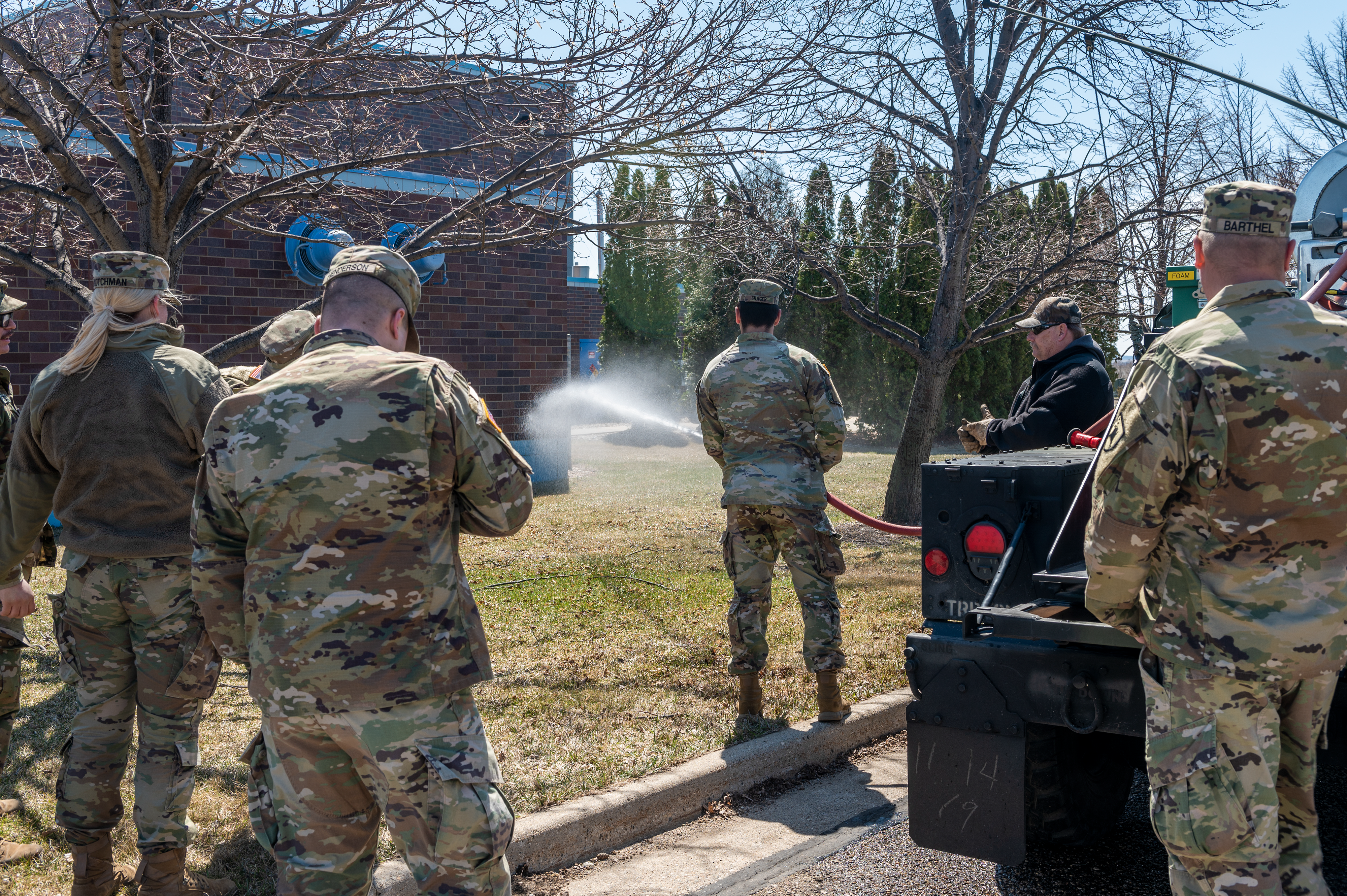 Randy Jacobson, N.D. Department of Emergency Services, instructs N.D. National Guard Soldiers on how to clear a fire hydrant as part of their wildland firefighter certification at Raymond J. Bohn armory in Bismarck, May 1, 2022.