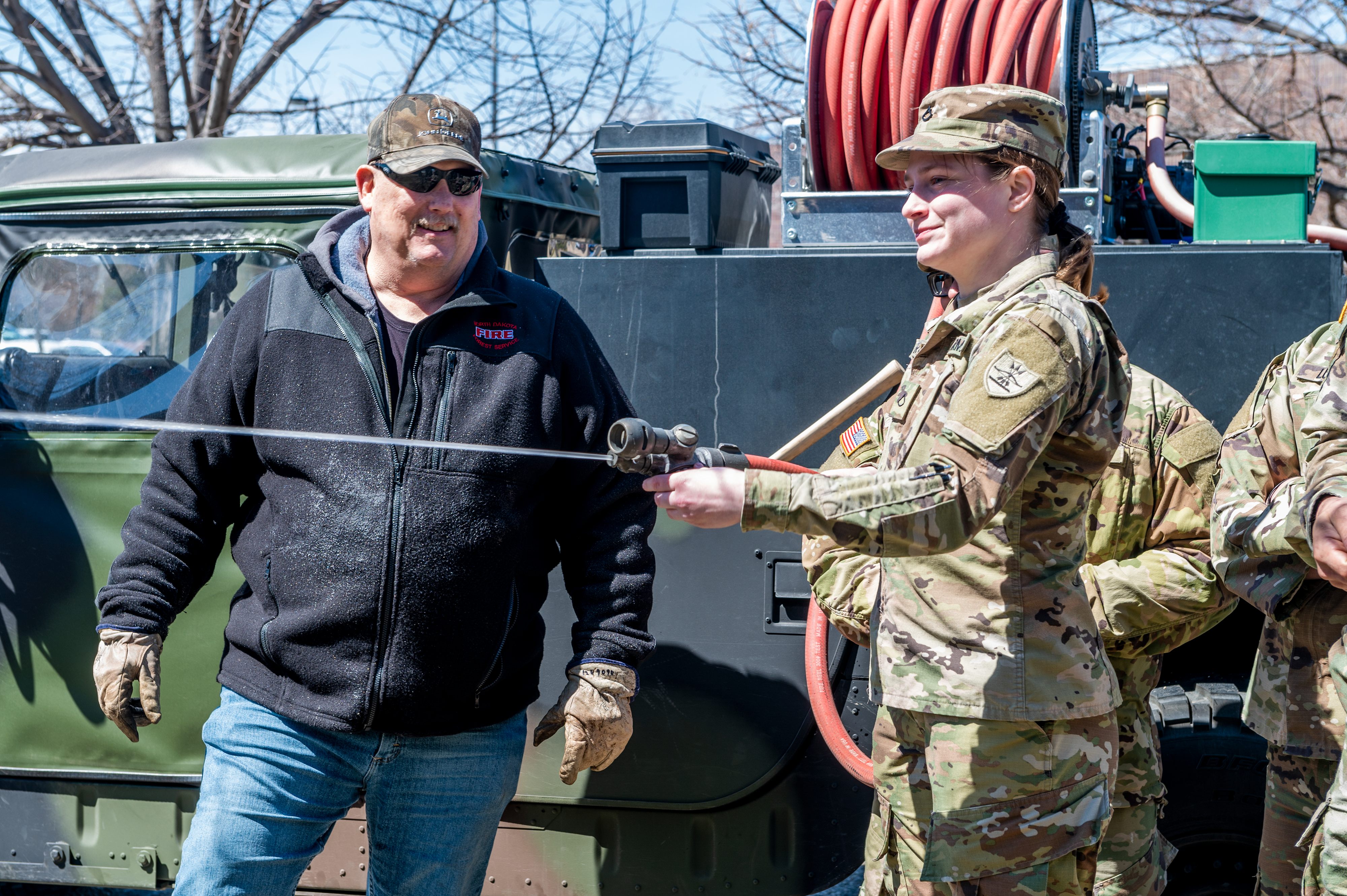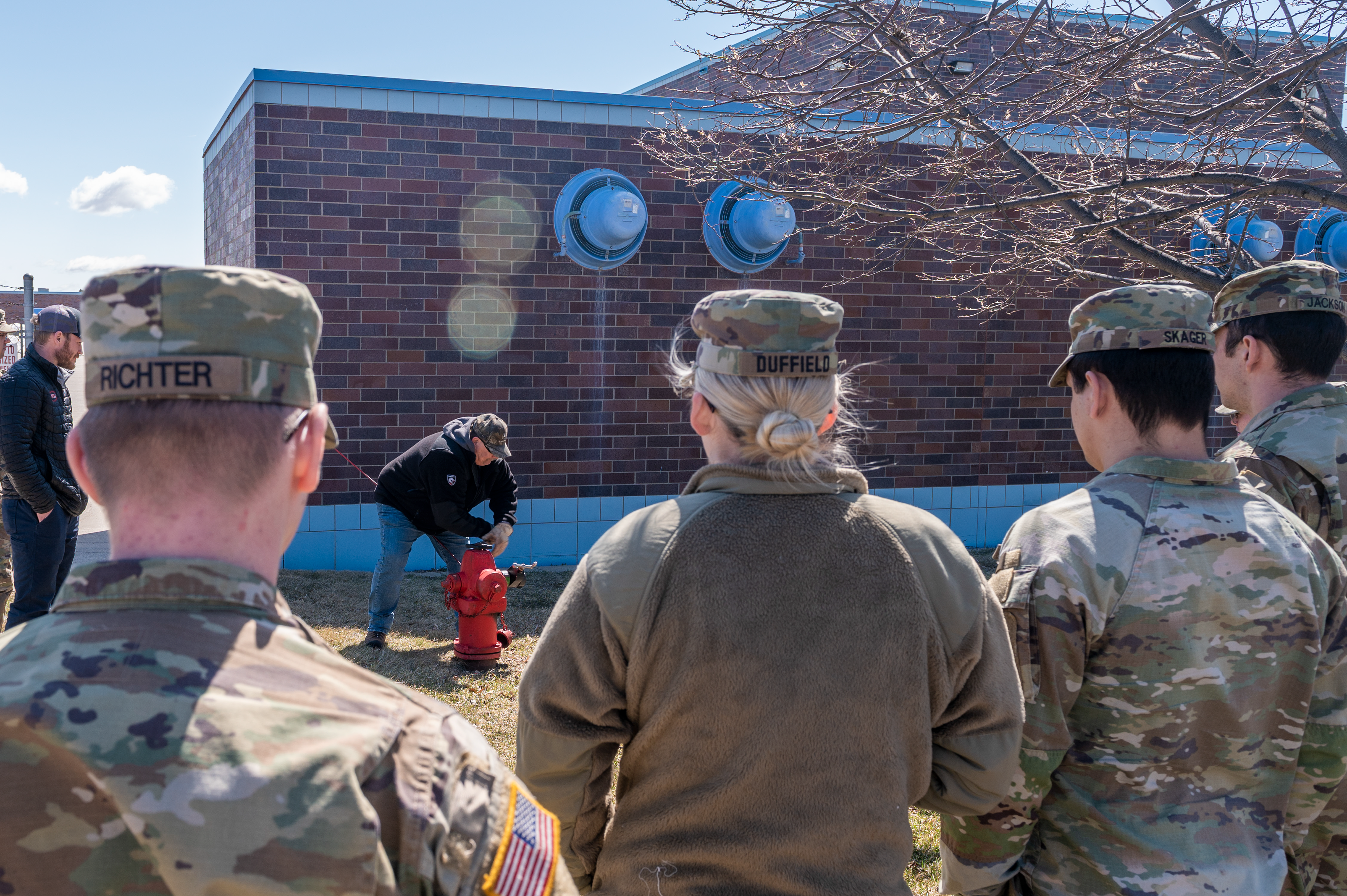 Randy Jacobson, N.D. Department of Emergency Services, instructs N.D. National Guard Soldiers on how to use a fire hydrant as part of their wildland firefighting certification at Raymond J. Bohn armory in Bismarck, May 1, 2022. (National Guard photos by Officer Candidate Michaela C.P. Granger, N.D. National Guard Public Affairs Office)