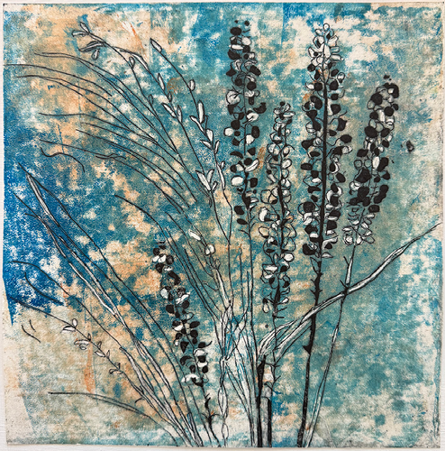 Above Print: Janis O'Driscoll: "Garden Twilight", drypoint with monotype mounted on wooden panel, 12" x 12"