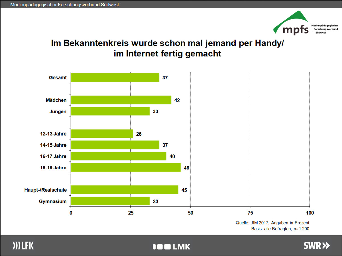 - In der Altersgruppe der Zwölf- bis 19-Jährigen geben Zwei Fünftel (37 %) an, dass in seinem Bekanntenkreis schon einmal jemand im Internet oder per Handy fertig gemacht wurde.