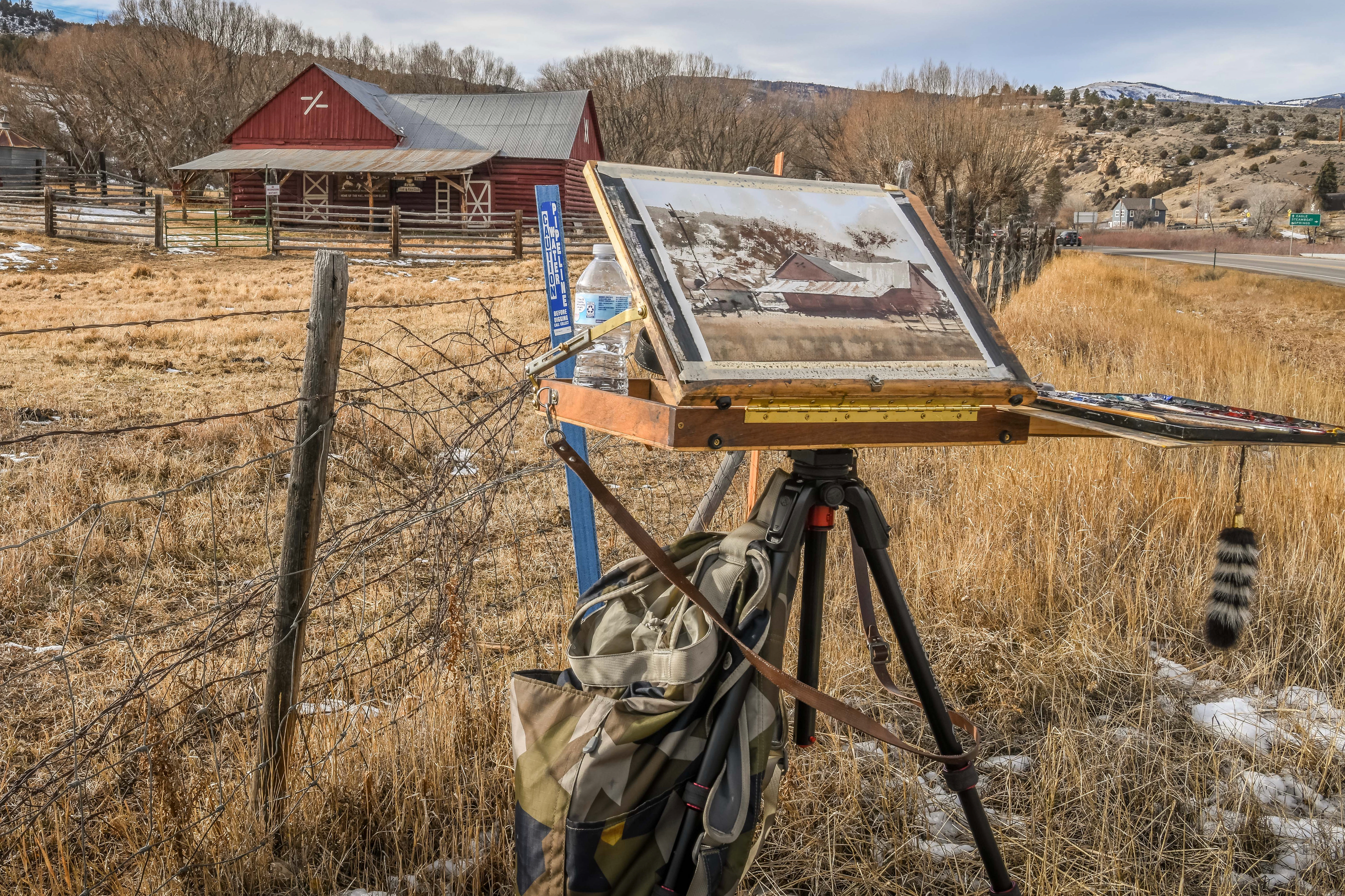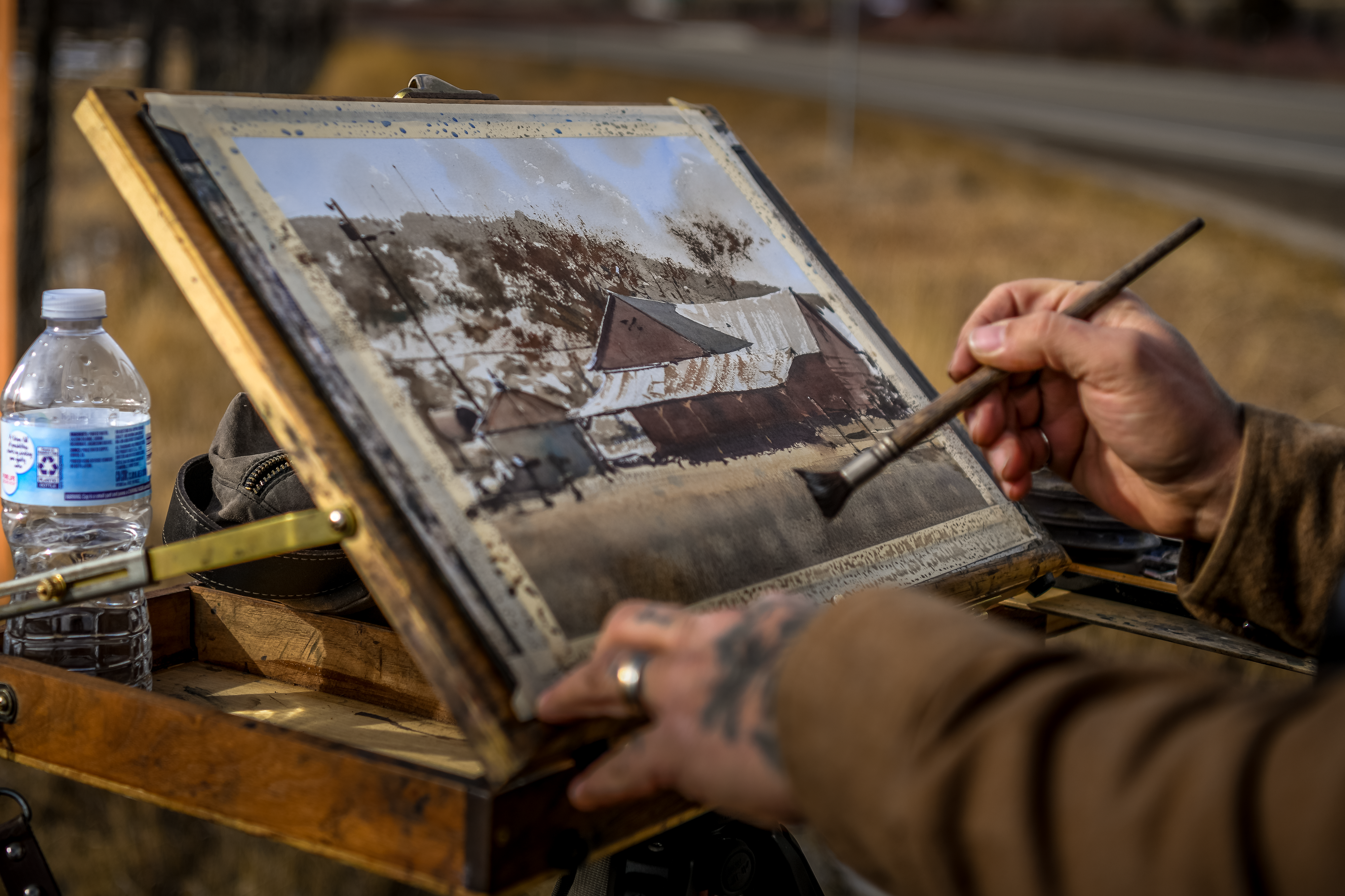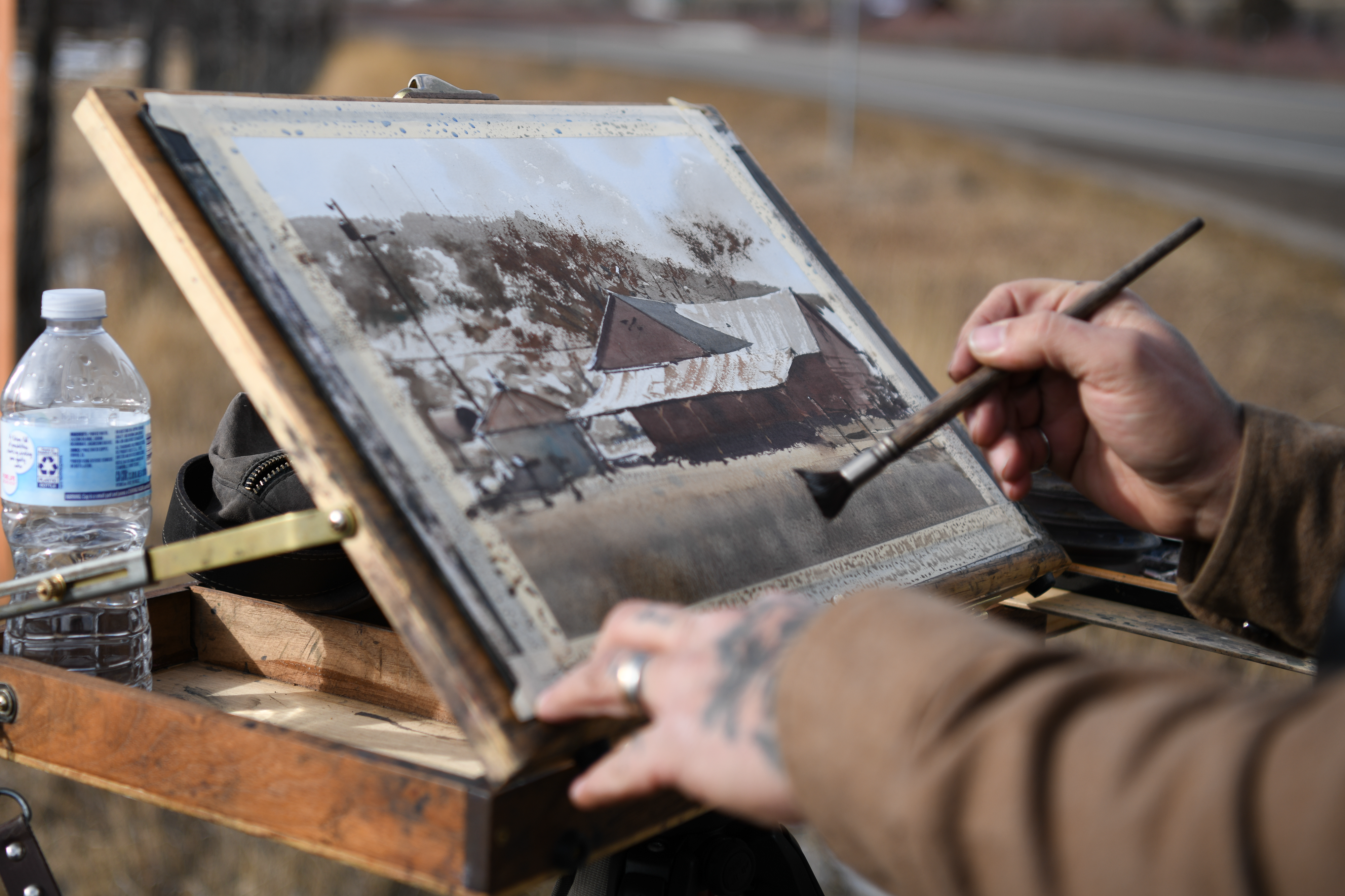 Meeting Daniel Marshall, one of Colorado’s most decorated watercolor artist was pure luck. Driving the quiet backroads of Route 6 parallel to the east bound highway I could not help but notice a painter facing the iconic red barn and stable in Wolcott, Colorado.