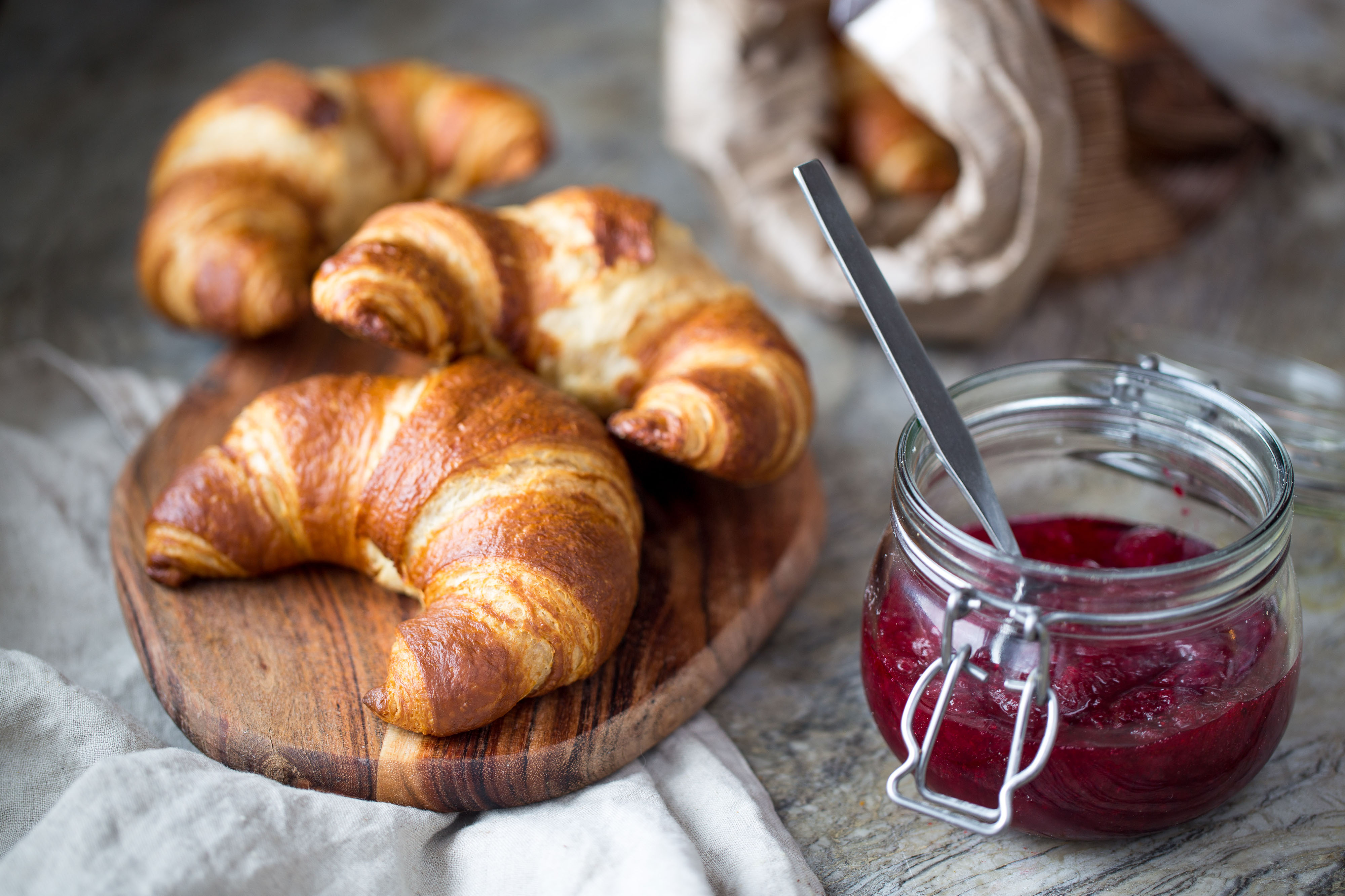 - Vers afgebakken croissants met roomboter en vruchtenjam