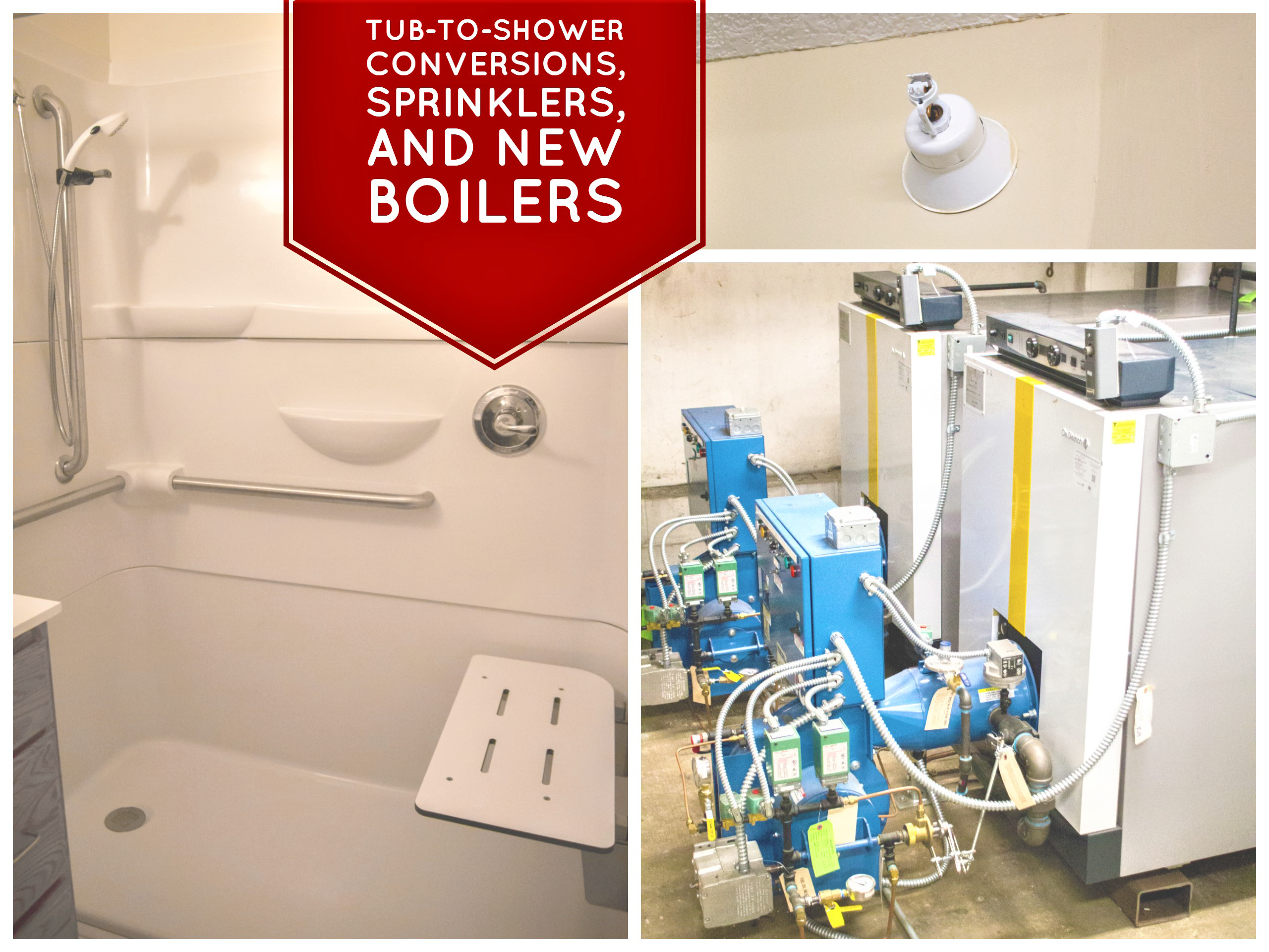 In addition to replacing interior apartment doors and making tub-to-shower conversions in all the units to improve accessibility for the seniors, the renovations also included putting in a sprinkler system and updating the emergency response system. Two boilers were also replaced and minor modifications were made in the community kitchen and dining rooms for accessibility compliance.