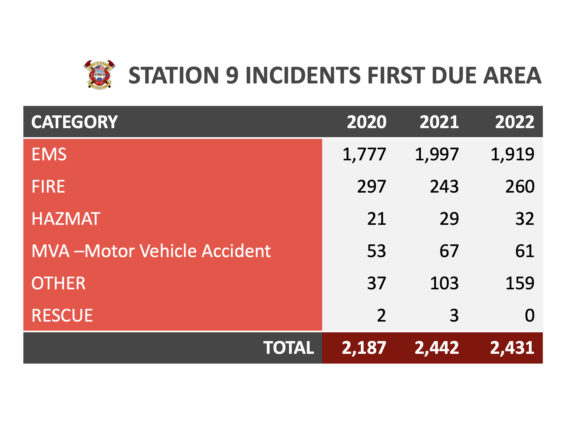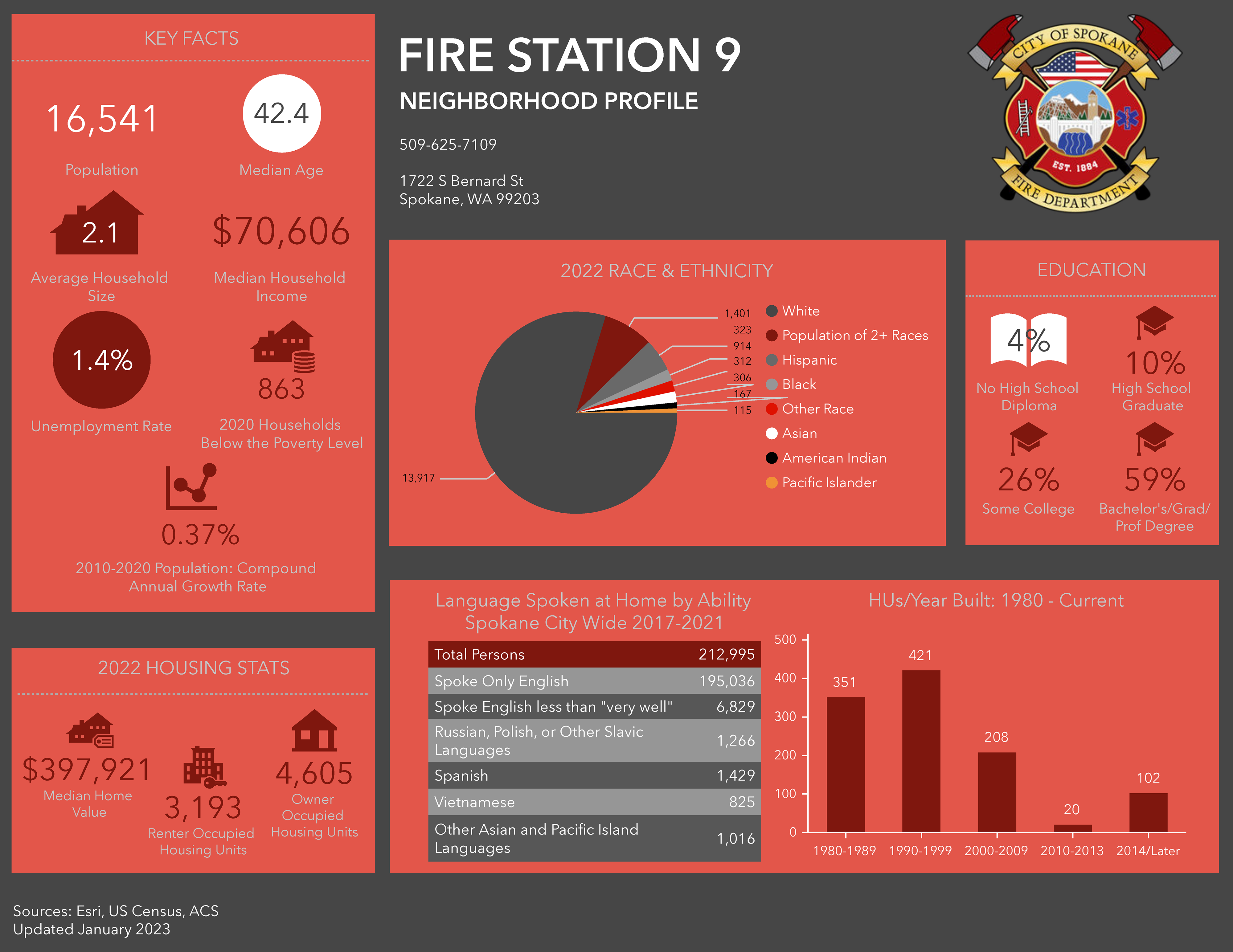 Spokane Fire Department (SFD) Station 9 was originally established in 1908, and relocated to 1722 S. Bernard St. in 1992, where it continues to serves the Manito and Comstock neighborhoods. Located on the South Hill, Station 9’s response area includes seven city parks.
