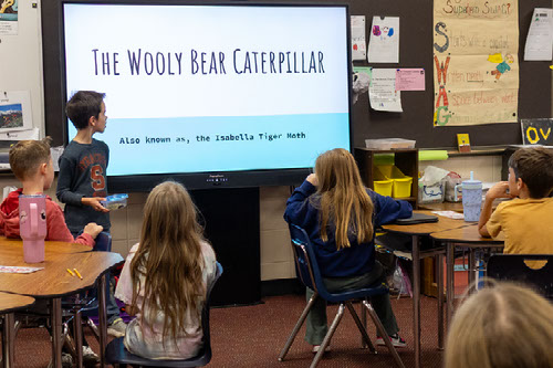 Students in Mr. Gross’s class recently learned about the life cycle of the woolly bear caterpillar through a presentation by third grader Hudson Wentworth. Hudson shared information about how the caterpillar will eventually become an Isabella Tiger Moth, and he created slides to help explain each stage.