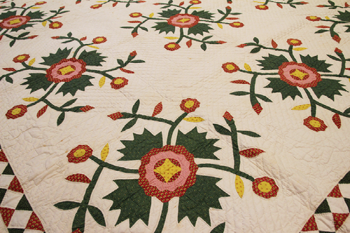 Cotton, wool, linen, and silk were the main materials that were used for textile production in from the mid 1700s to the mid 1800s. The spinning corner of the exhibition displays multiple hand-powered tools that allowed the craftspeople to process the materials before they created quilts, coverlets, samplers, and hand towels. The production of textiles would start to change around the 1850s, as steam powered machinery would take over the industry.