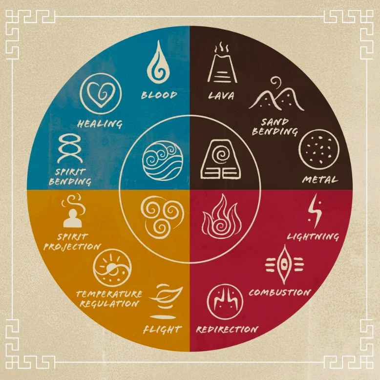 An example of a firebending sub-skill is “lightning bending”, using a more concentrated and directed form. This is where the show begins to pave the way for imagination amongst viewers, as the idea of sub-skills generates an endless list of possible skills with all logistics in mind.