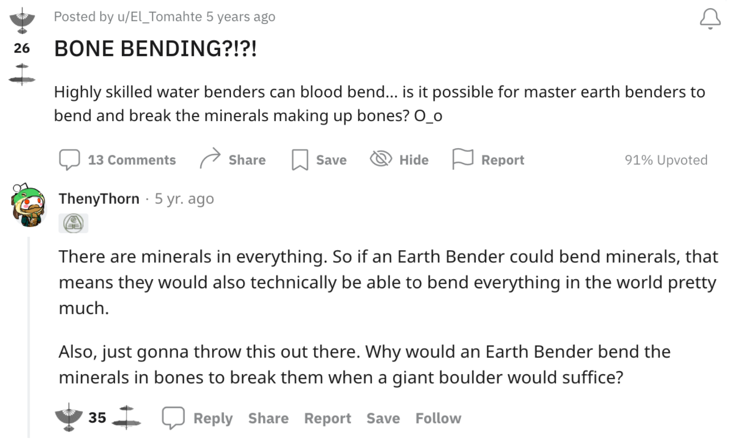 The lexis created and utilized by this discourse community helps to bring fans into a more spiritual and imaginative commonspace to share ideas and debate technicalities. Because of the show’s creativity, fans often wonder about even more possible bending abilities that aren’t mentioned in the series. One Reddit user(El_Tomahte) asked if “bone bending” could be a possible sub-skill of earthbending. Another user(ThenyThorn) responded with very logical reasoning to the question. The creativity that the fanbase generates from the lexis is what allows these fans to come up with more ideas that are branched off of already established ideas concepts from the show.