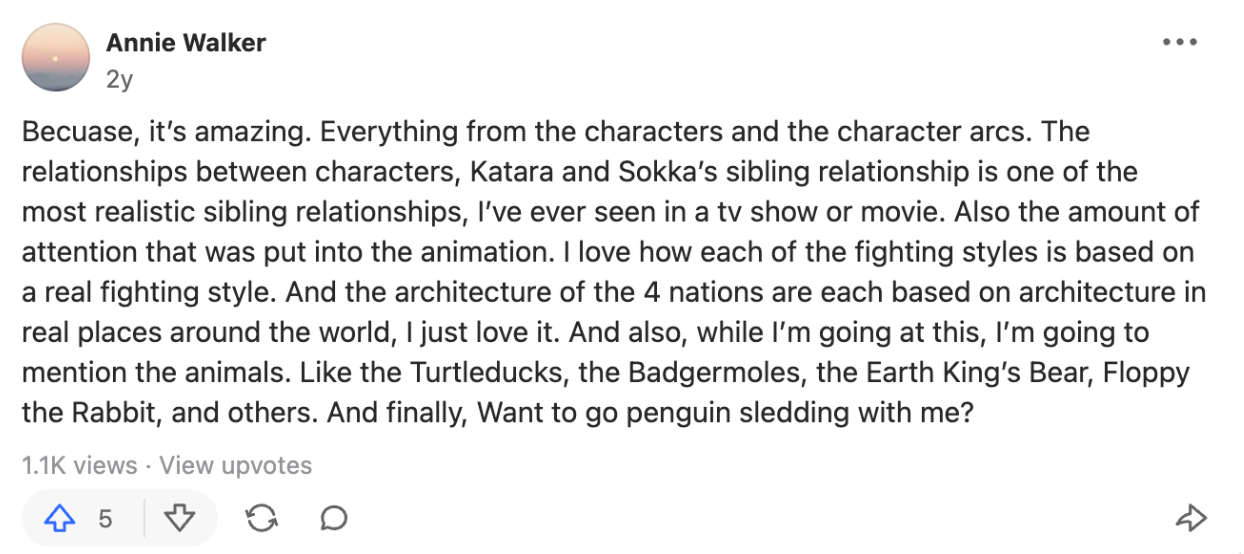 Through primary observational research, I was able to dive into the fandom of Avatar and witness the activity going on with my own eyes. One Quora user, Annie Walker, decided to answer somebody’s question asking why everyone cares about the show so much. It is the power of the fanbase that revealed the demand for more content, which is why the studio is now beginning to make a live-action Avatar series.