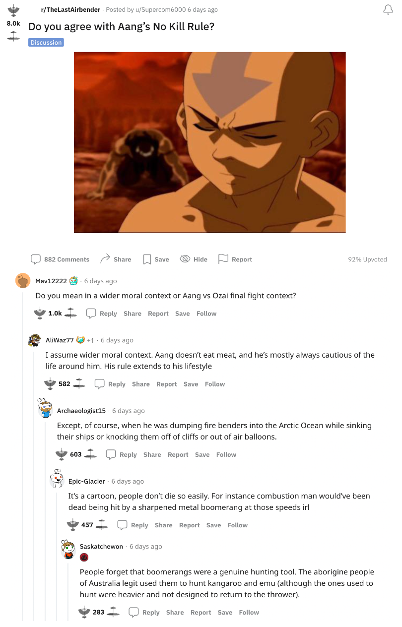 On Reddit, a huge debate occurred over the rationale of Aang’s decision. People are shown to share very thought-provoking ideas in the comments of these posts, such as one person mentioning the resilience of cartoon characters and that they “don’t die so easily”(Reddit). Posts like these are what allow the fandom to circulate on a particular concept, such as common human morals, taking the show’s significance to a whole new level.