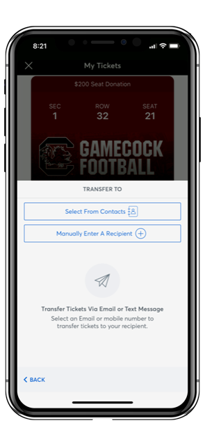 Select from your contacts or manually enter in another persons info to transfer tickets (via text or email).