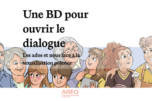 Au cours du triennat 2023-2026, le comité national des femmes avait pour mandat d’explorer le phénomène de la sexualisation précoce pour ensuite développer un outil visant à faciliter les discussions intergénérationnelles autour de cet enjeu. Cette bande dessinée constitue l’aboutissement de ce travail et c’est avec une immense fierté que nous vous la présentons aujourd’hui. Tout d’abord, nous tenons à féliciter les membres du comité qui ont travaillé main dans la main, en faisant preuve d’une grande ouverture d’esprit, pour convenir des thèmes à aborder et rédiger les dialogues de chaque mise en situation. Le résultat final est à l’image du travail qu’elles ont effectué tout au long de ce triennat : coloré, inspirant et empreint de bienveillance. Nous adressons notre plus profonde reconnaissance à madame Francine Duquet, Ph. D. sexologue, pour le soutien inestimable apporté tout au long de la réalisation de ce projet qui, sans elle, n’aurait pu voir le jour. Nous ne pouvons également passer sous silence le magnifique travail d’illustrations réalisé par Caroline Soucy qui a su donner vie à notre vision et à nos personnages avec une sensibilité et un talent remarquables. Enfin, nous tenons à remercier toute l’équipe de l’AREQ qui a participé de près ou de loin à la réalisation de ce projet. Il y a un peu de chacune de ces personnes dans cette bande dessinée et c’est ce qui en fait un projet aussi spécial. Nous espérons que ce court ouvrage ouvrira la porte à de belles discussions empreintes d’empathie et de bienveillance entre grands-parents, parents et petits-enfants. Bonne lecture! Brigitte Roy Responsable politique du dossier des femmes Maude Tweddell Conseillère