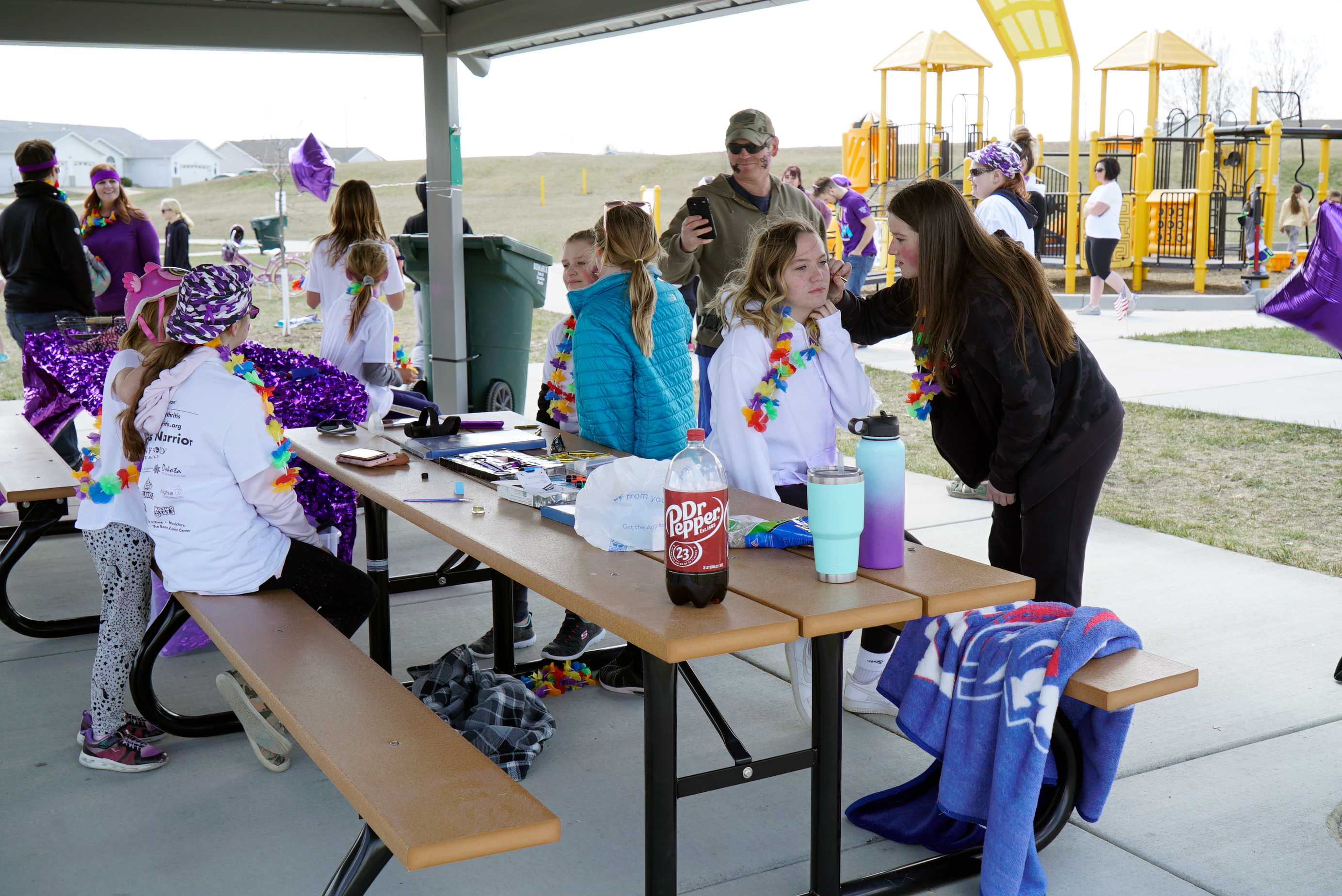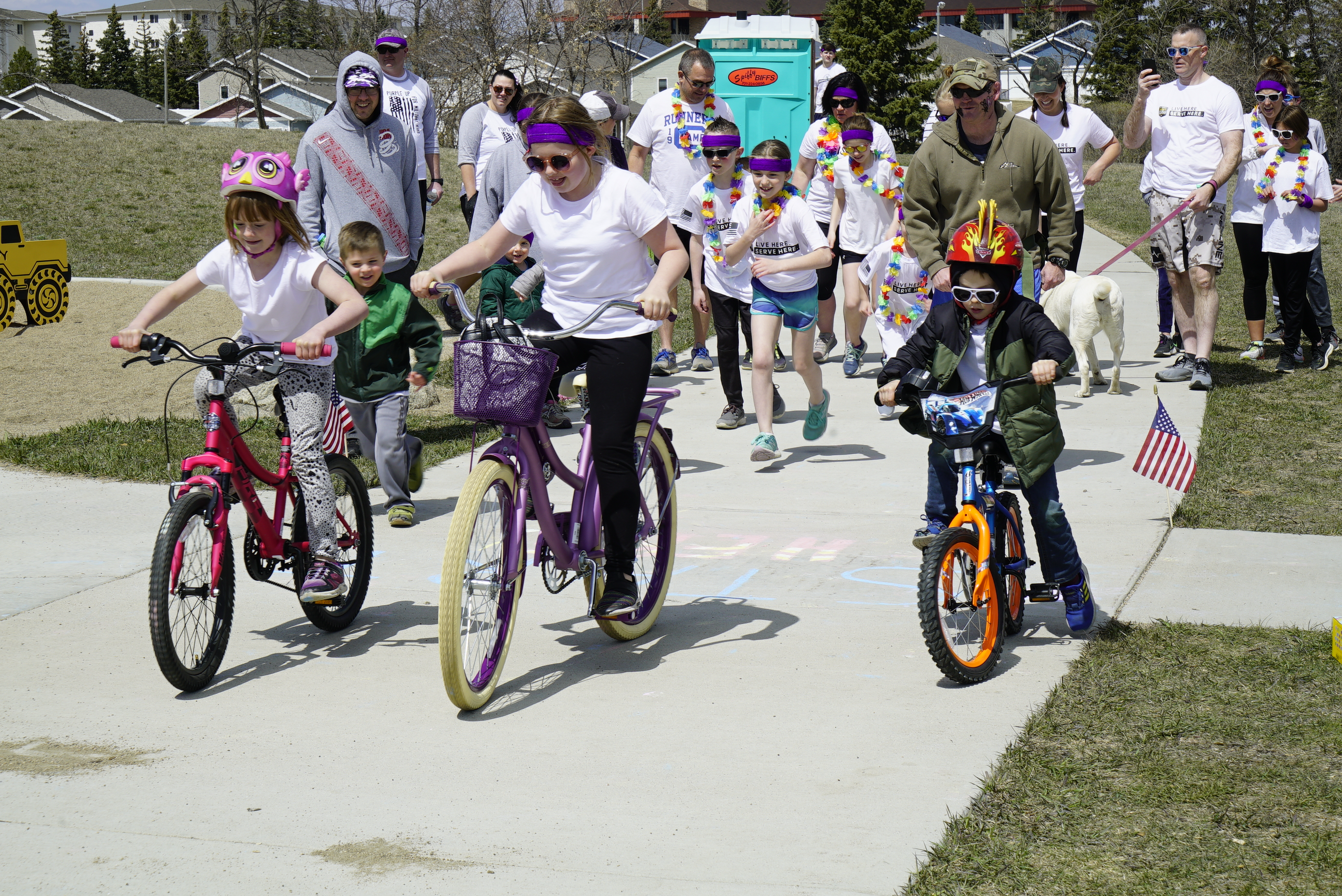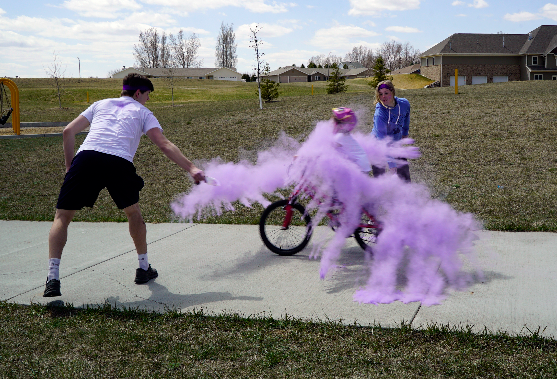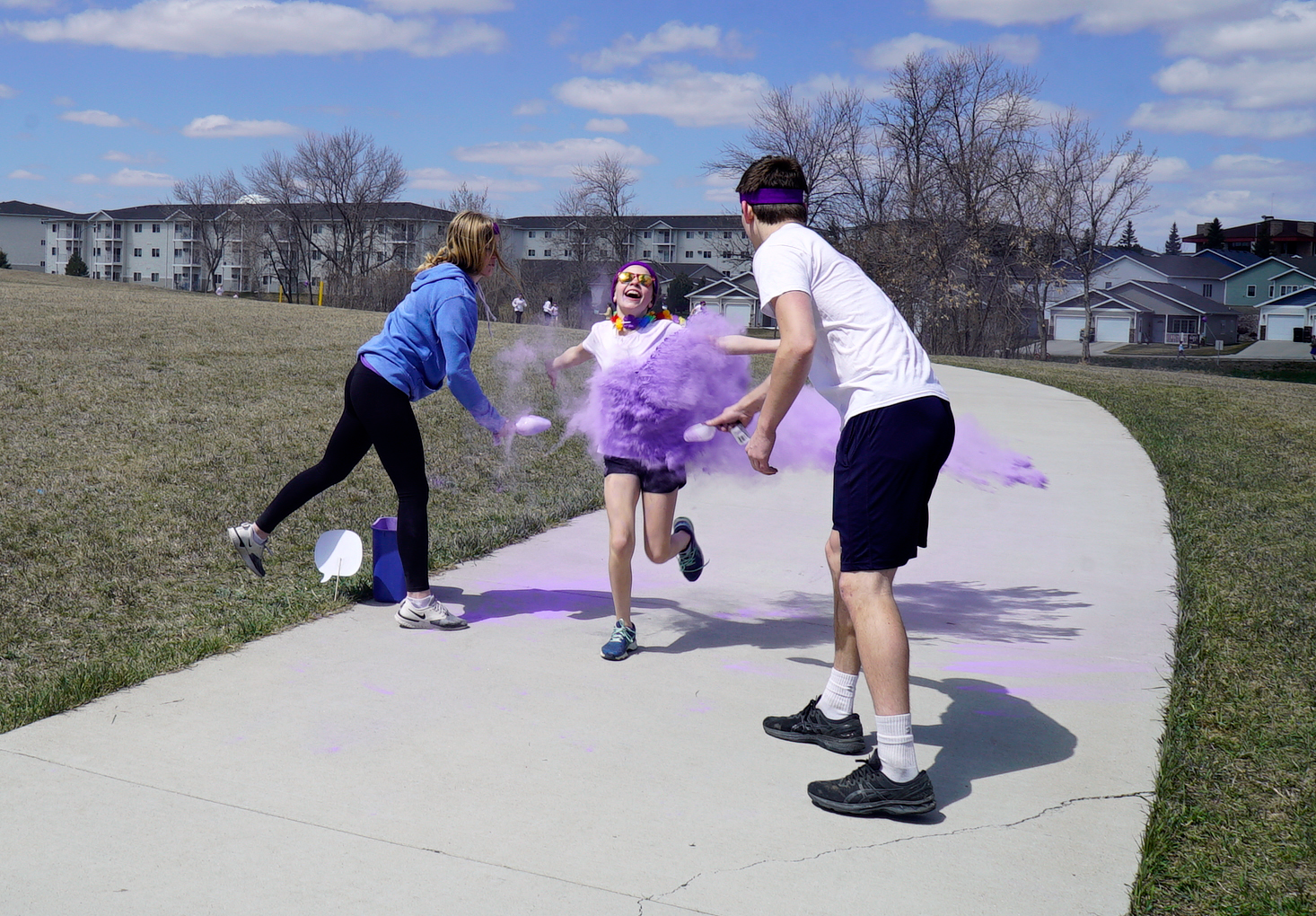 Madisyn Lowe ran through purple calk being thrown by Hailey McEvers, Military Teen Council member, and her friend Austin at Normandy Park in Bismarck, April 24, 2021.